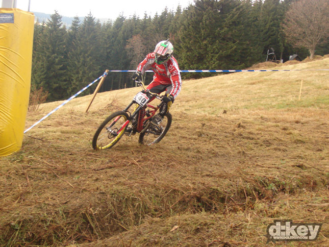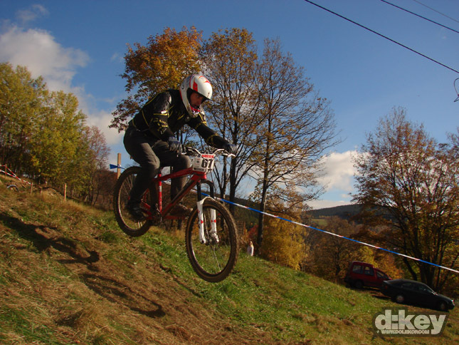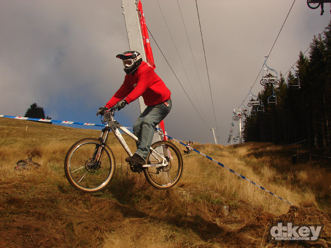 Předpověď strašila, že v sobotu napadne sníh, naštěstí jim to zase nevyšlo a v noci jenom mega zapršelo. Takže ráno proběhlo přezouvání na mokrý práště, kdo měl jenom suchý byl trochu smutný, protože dopoledne byl povrch trati hodně mokrý, postupně to vysychalo a na kvaldu se již jezdilo na suchu. Trať doznala o proti loňsku pár změn, subjektivně ji hodnotím jako lepší, zábavnější, o fous těžší. Délka byla v podstatě shodná s loňskem, délka max dva kilometry, nejlepší se s časem dostali pod dvě minuty. Na trati kousek před cílem přibylo nejtěžší místo, sestupák-o-drop do mega prudkého dopadu, možností jak jej překonat bylo víc, kdo měl morál dával jej z horní hrany – tak to vycházelo na nějakých 5 metrů, kolo na dopadu dostalo nehorázně nažrat. Druhou možností bylo dát dropík ze spodní hrany, to bylo výrazně jednodušší a taky tuto možnost volila většina. Bohžel toto místo si vybralo několik svých obětí, první náš brněnský Béďa Hájek v první tréninkovce vyslal frontflip a klička to odnesla, další úrazy proběhli v kvaldě, naspeedovaný Aleš Rogožan strašná tlama, prasklá vidlice a něco s pánví. Další obět si nepamatuji, ale jelikož jsem jel v kvaldě pár jezdců za ním a viděl jsem jak mu horská služba vytahuje zapadlý jazyk, asi to taky byla dost rána. Ostatní jezdci si s nástrahami trati poradili lépe a tak z 164 startujících na startu kvaldy mohlo do vyřazovacích bojů postoupit nejlepších 64 střelců.