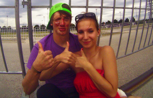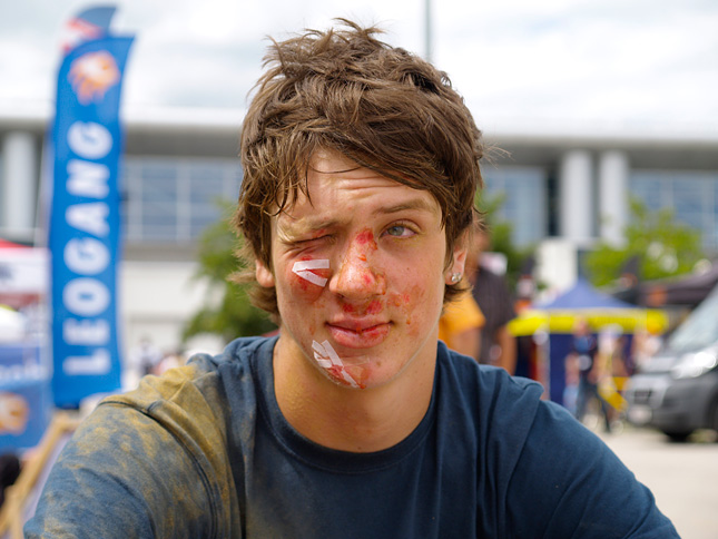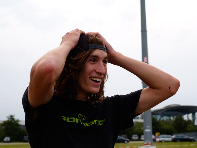 Dudo: Tesne pred kvaldou sa blížili čierne mraky, každému bolo jasné, že dážď nás neminie. Stihli sme odjazdiť aspoň jednu jazdu, okrem Jamesa Fostera, Andreu Lacondeguya ktorý si priviezol aj BMX bike a Christiana Porassa. Týto traja dostanú priestor na svoju jazdu v sobotu. Mnohý ako aj ja bojovali z měkkými skokmy a nedostali sa ani k posledným skokom. Ja som skončil hneď po treťom.
