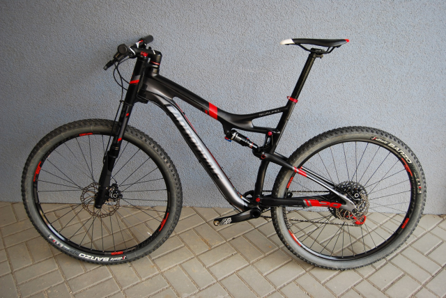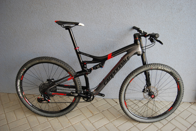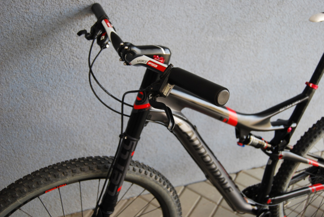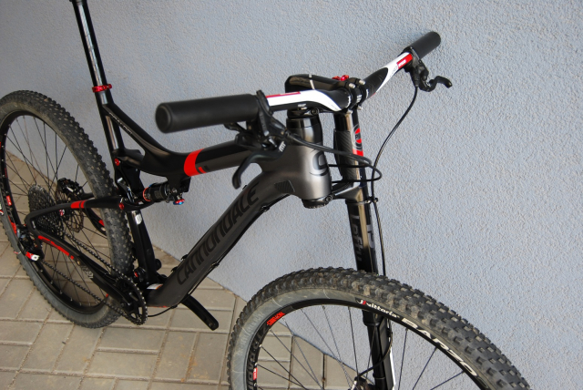 Rychlé karbonové celoodpružené kolo Cannondale na 29 palcových kolech. Velikost rámu je XL, pro výšku přibližně od 184cm.