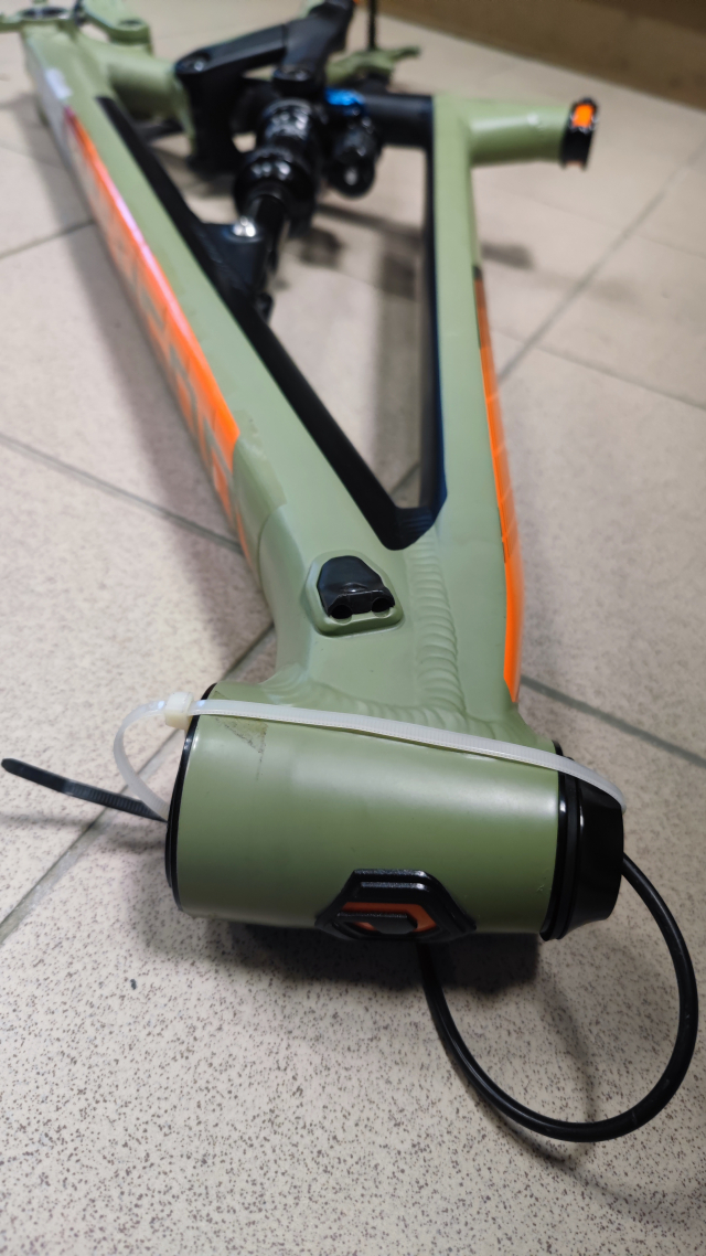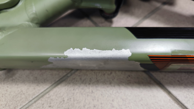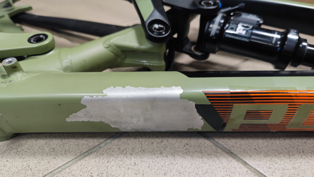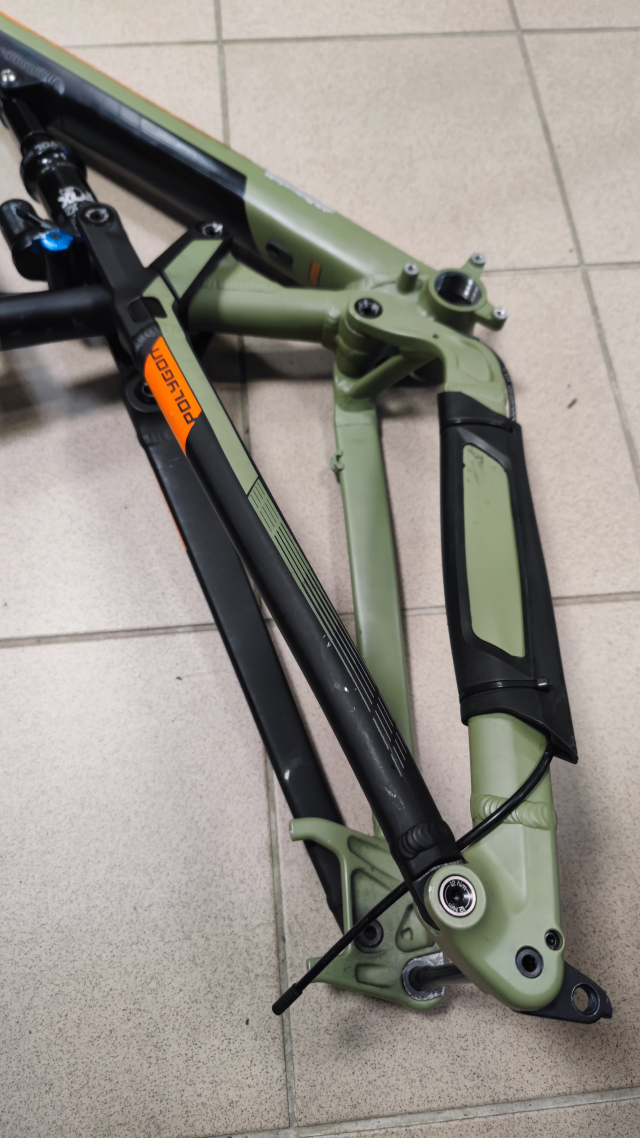Rám je vo veľmi dobrom stave vrátane tlmiču. Má iba na spodnej rámovej trubke oškretú farbu - dá sa jednoducho prelepiť napr gumovou páskou na ochranu voči kamienkom. Rám som mal vyše 5 rokov zabudnutý v garáži, takže je v podstate ako nový.