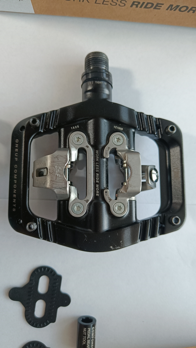Prodám pedály OneUp Clip Pedal nášlapy se zárukou na 2 roky (koupeno 16.9. 2025, doklad o prodeji součástí), pedály mají za sebou jedno vyzkoušení na trailech, na černé barvě pedálů a zámků jsou odřeniny laku od zkoušení nacvakávání, na hraně jednoho pedálu je drobná odřenina od kamene viz, foto, vše je zohledněno ceně (sleva 800 kč), vše v kompletním originálním balení včetně NUT TOOL (nástavce pro servis)