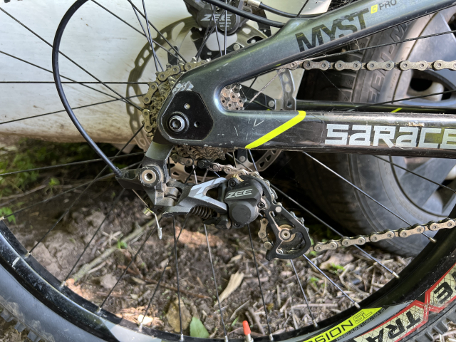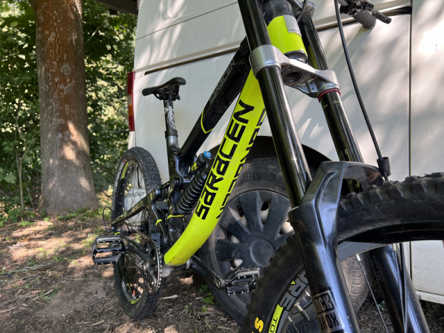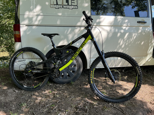 rám je v karbonu, tlumič vanila rc od foxu, vidlice rockshox boxxer rc, brzdy, kliky a přehazka shamano zee, řídítka, ráfky a představec kore