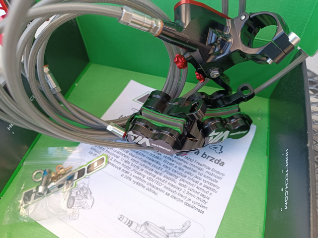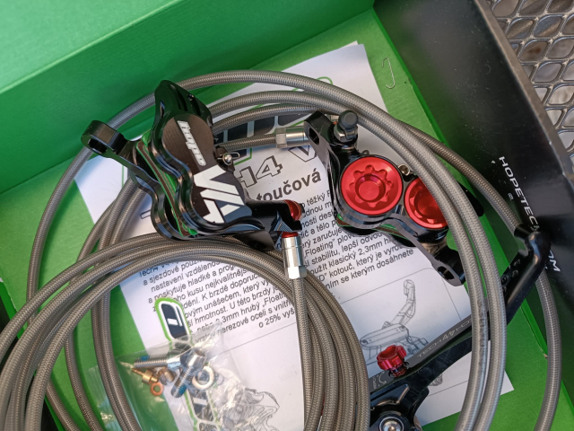 Prodám nové nepoužité brzdy HOPE 4 V4 s opanceřovanou hadicí + náhradní trn a olivy pro případ zkrácení hadice.