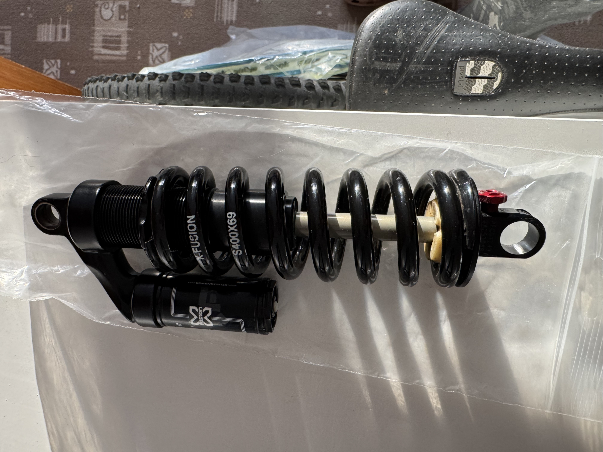 Prodám tlumič sundaní z kola Agang Ninja 2.0 FR 2013 o rozměru 222x69 s pružinou 400x69