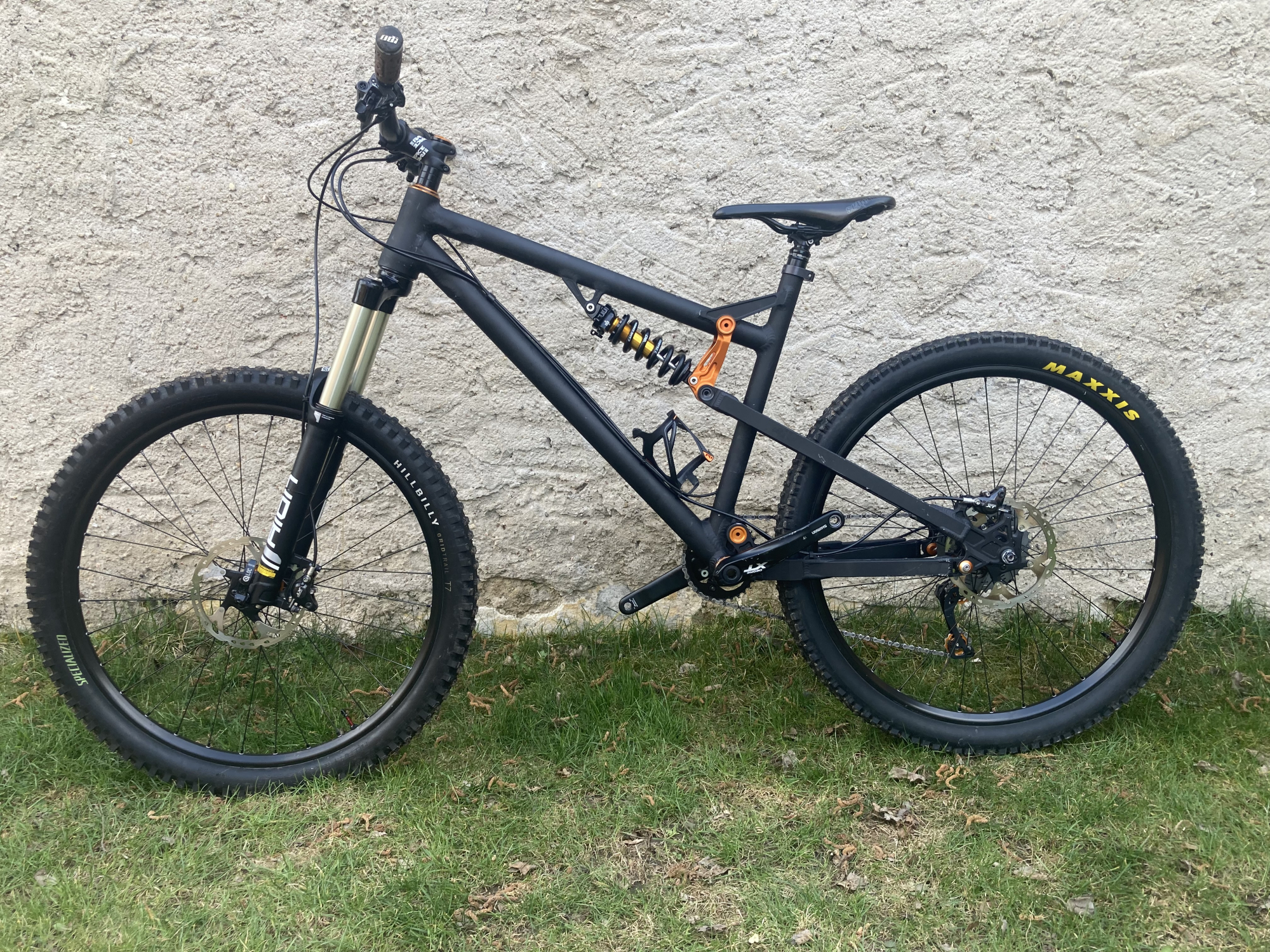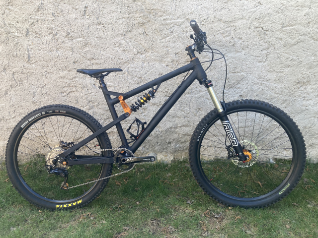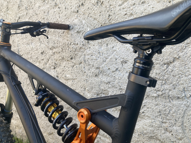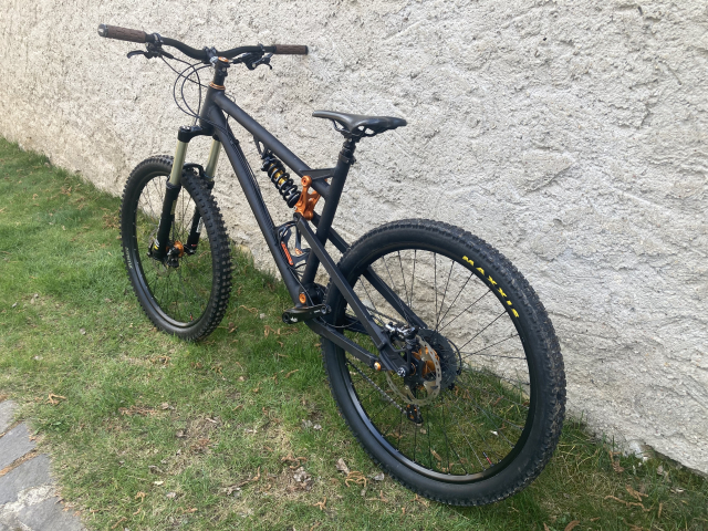 Kolo vyčištěno a promazáno. Rám není nikde prasklý ani promáčklý, jen provozní oděrky od ježdění a převozů. Nyní nastaveno na enduro/DH, viz níže přidám díly na předěláni pro trail/AM.