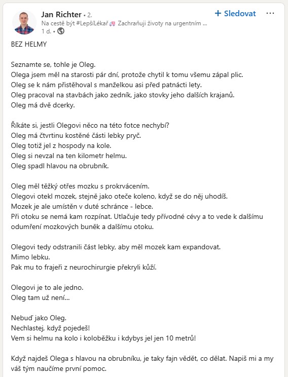 kokoska (kokoska (a) pastusi.tobolka) 9.7.2025 - 10:49Pohoda ... hlavně pak naložit na insta foto ze sanitky s pozeskym gestem jak je všechno nejvíc v pohodě (přestože sotva dejchá), a takhle třeba 3x za sezonu, ať se v tom mladasove vzhlédnou
