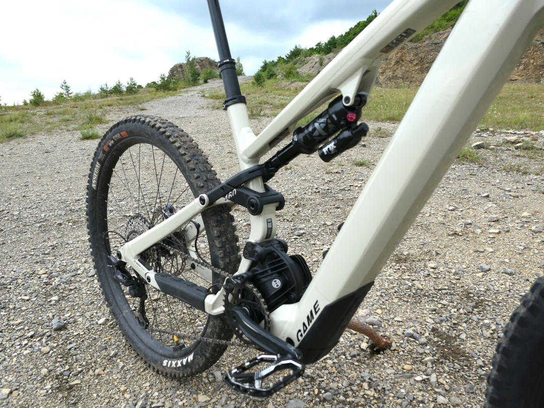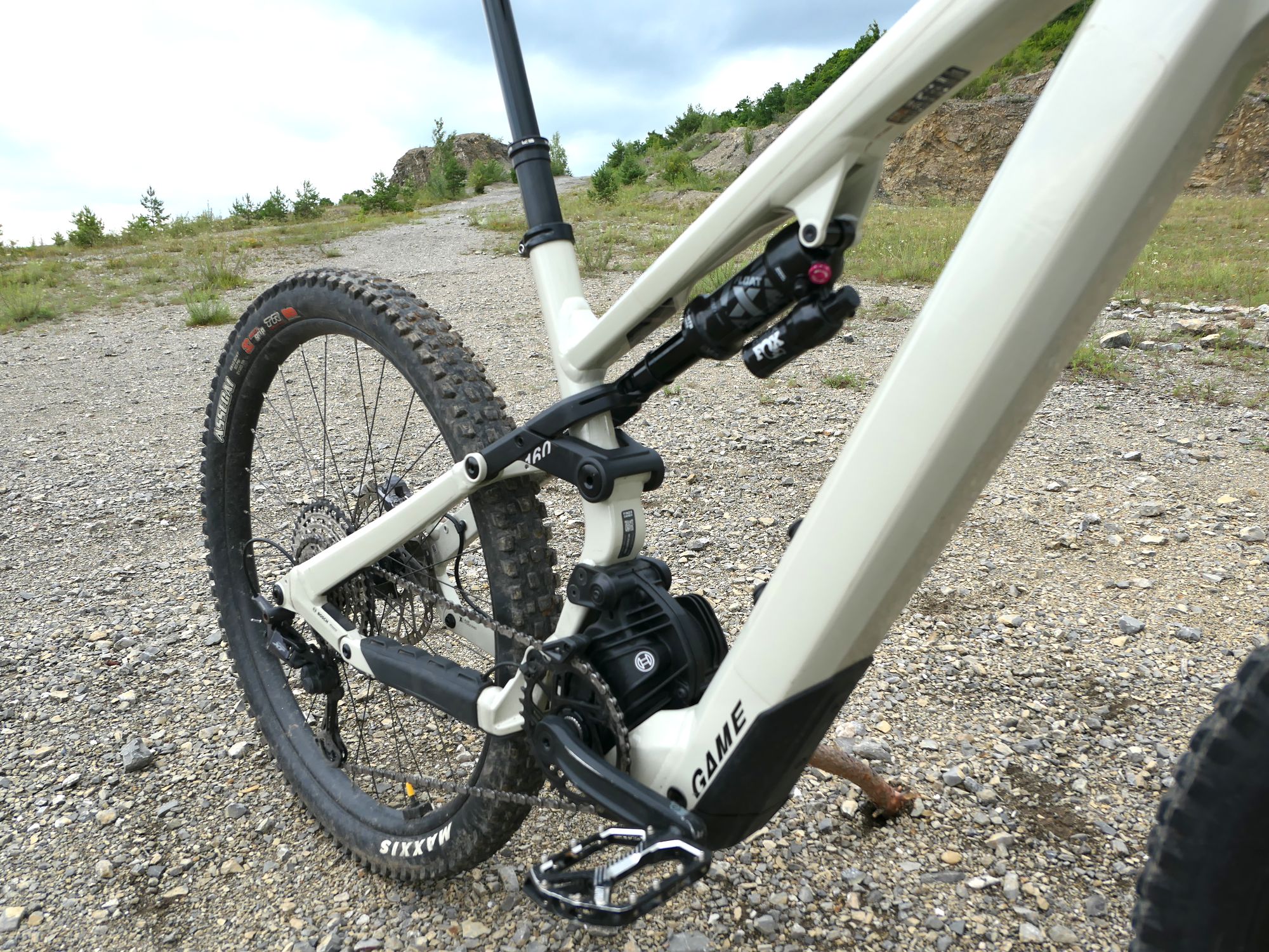 Další zajímavostí, na první pohled ne tak výraznou jako přiznaný motor, je umístění čepu na řetězové vzpěře. Game 160 využívá klasické čtyřčepové zavěšení s horst linkem, Zadní čep však najdeme až nezvykle vepředu. Nejen díky tomu kinematika Game funguje způsobem čím více jde kolo do zdvihu, tím více se zadní stavba "prodlužuje". V plném zdvihu naroste o hodnotu okolo dvou centimetrů.