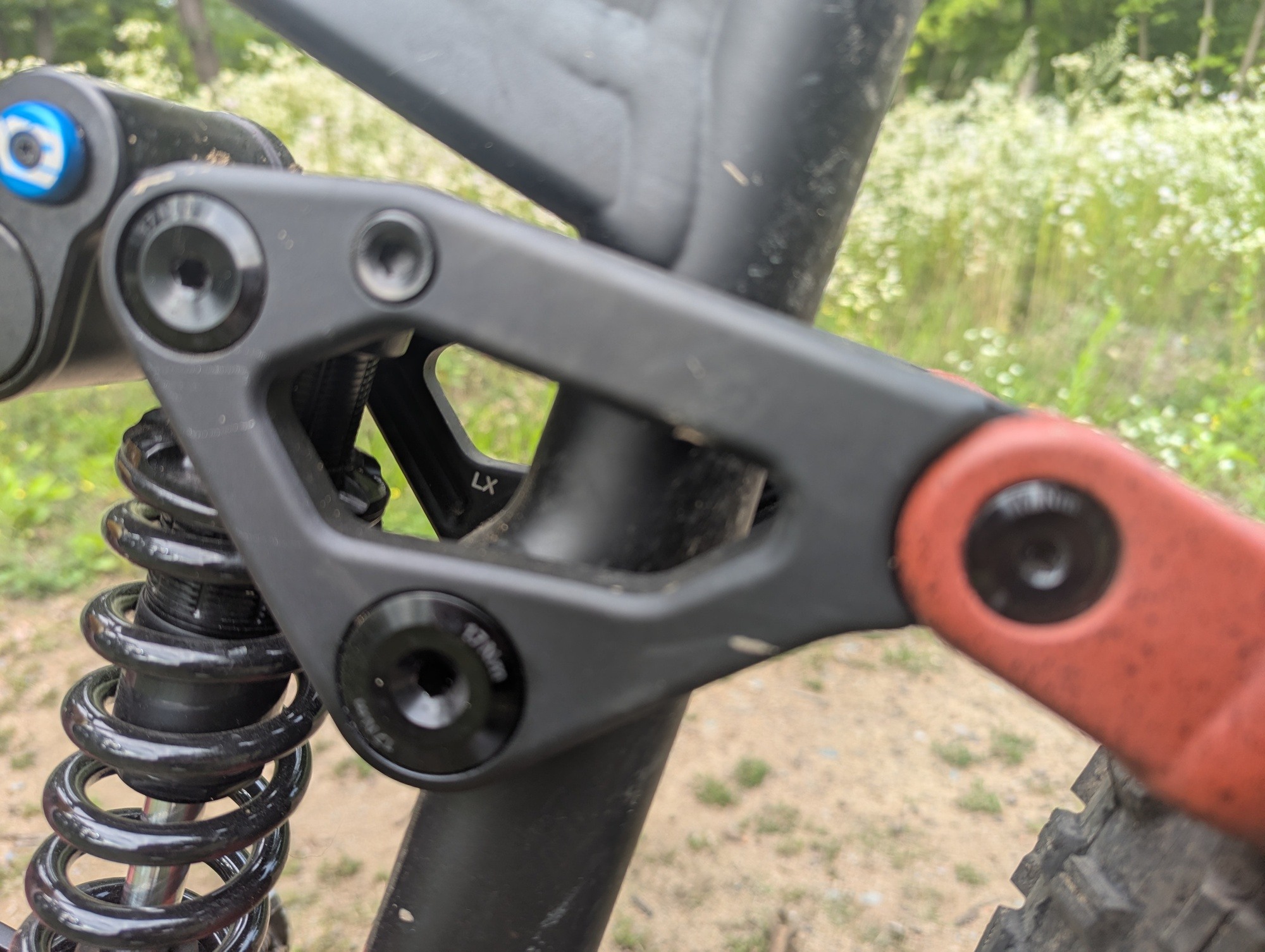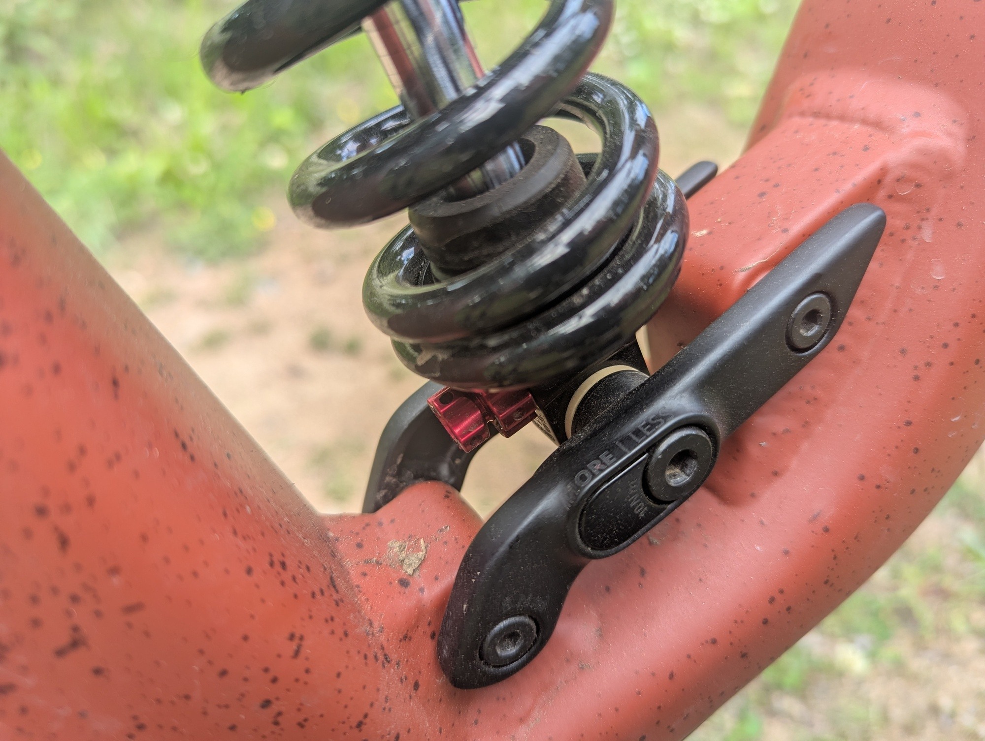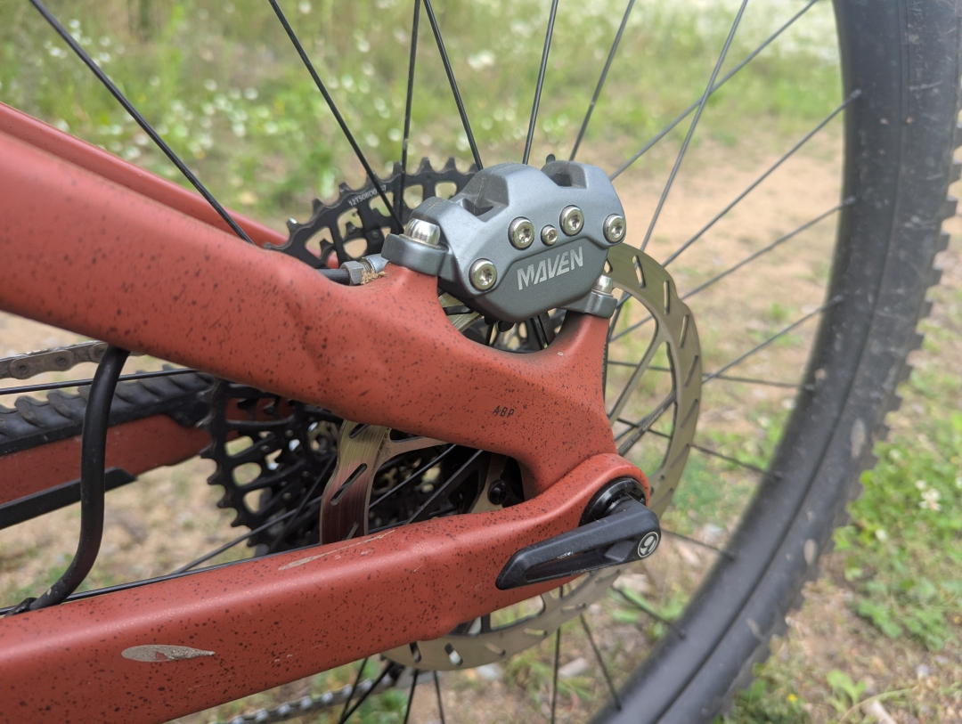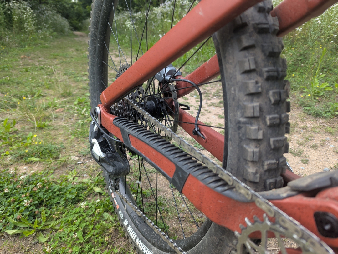 Na sedlových vzpěrách chybí můstek, respektive jejich vzájemné propojení. Obával jsem se vlivu na tuhost, ale moje obavy byly zbytečné. Za jízdy jsem jakoukoliv nedostatečnou tuhost nevnímal. Nicméně detailnější zkoumání vzpěr ukázalo, že k pár kontaktům se zadní pneumatikou došlo. Použít užší gumu než 2,5", k dotyku by určitě nedošlo.