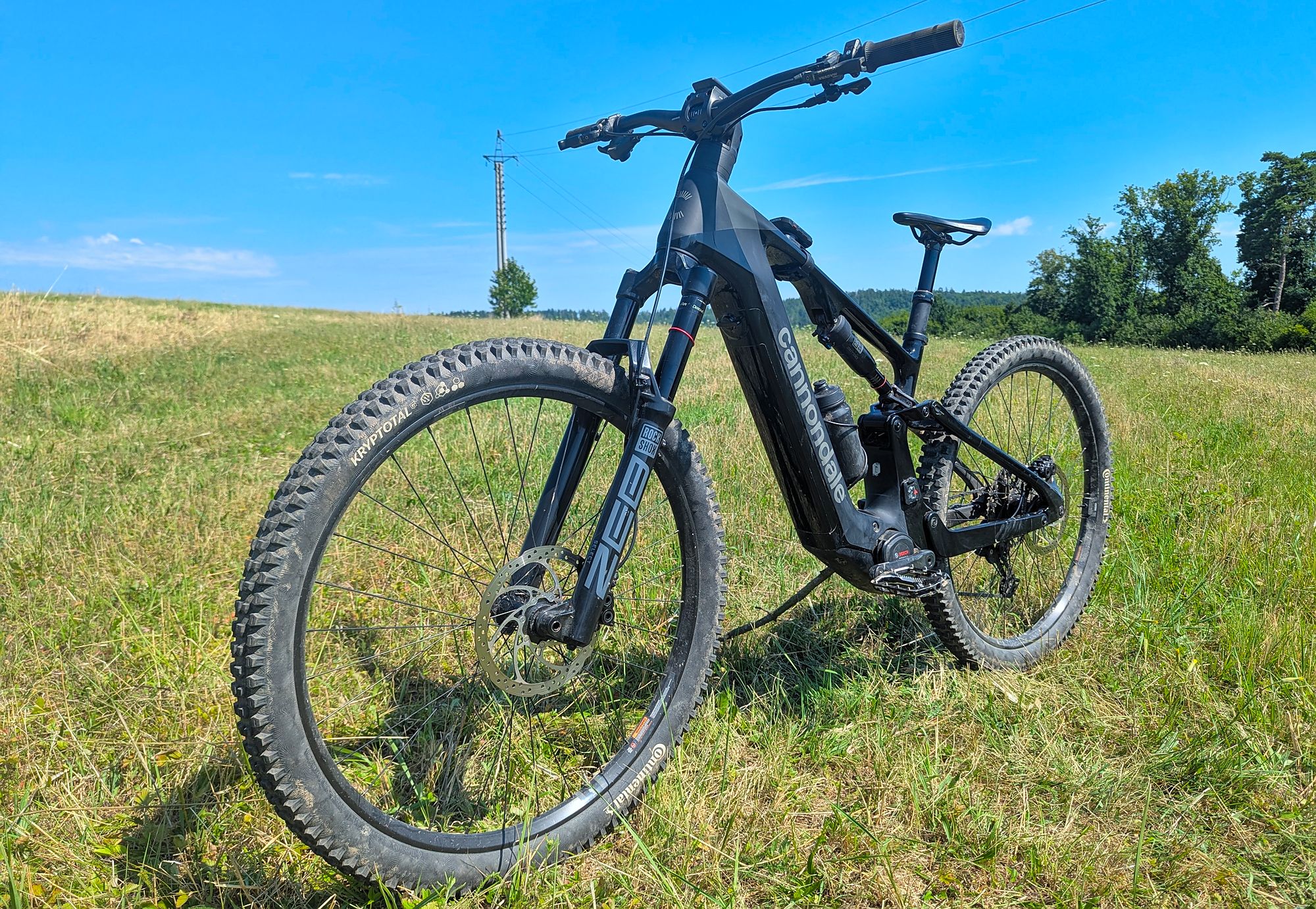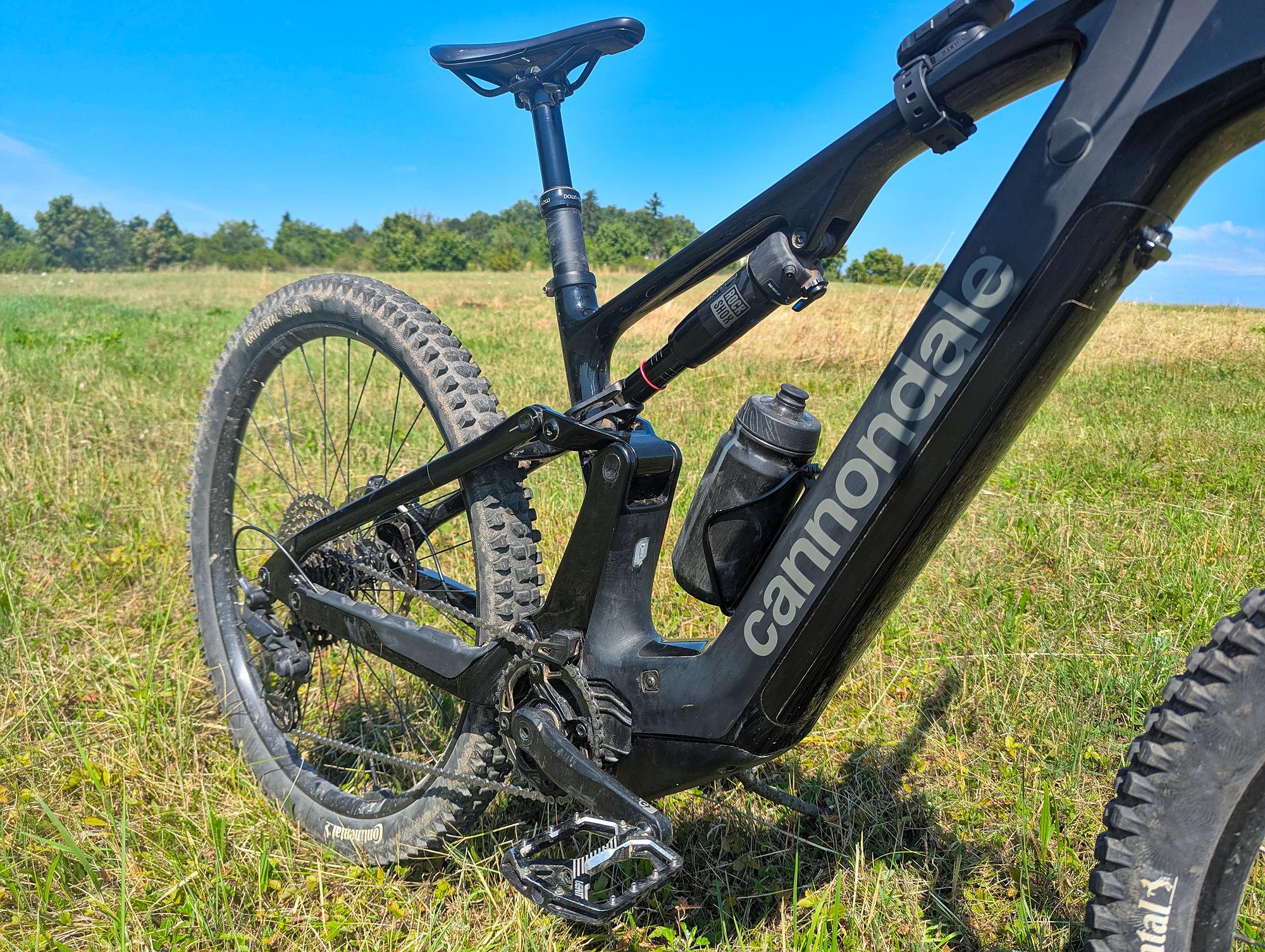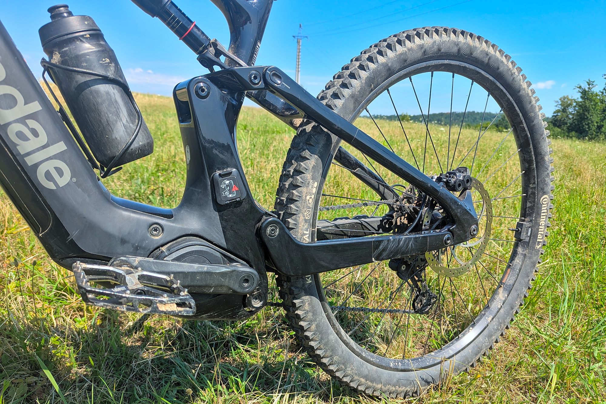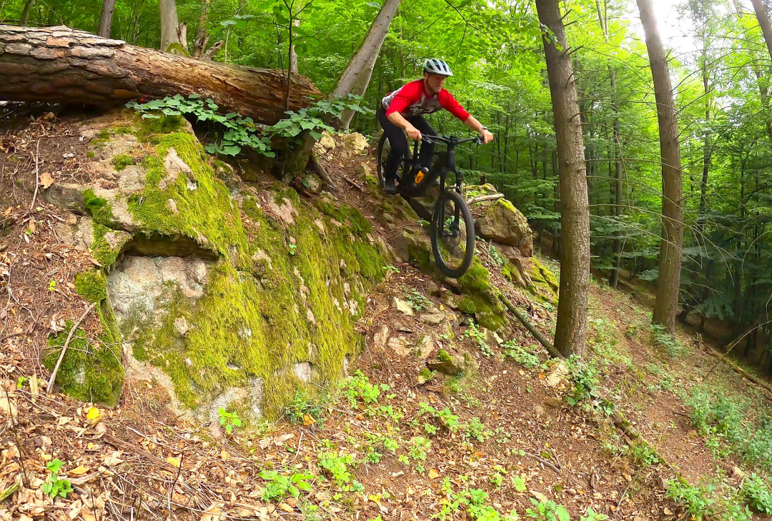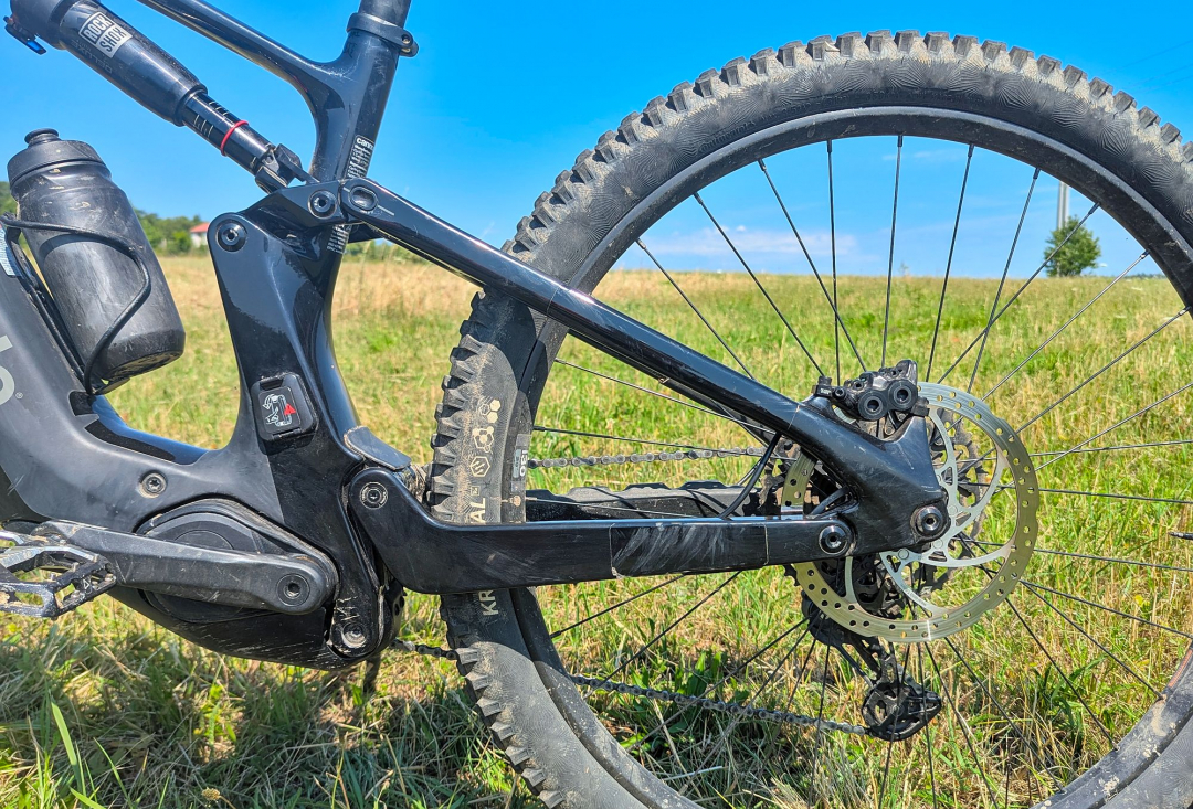 Výše zmíněné platí při cestě dolů, ve výjezdech za delší zadní budeš děkovat, ani v extrémně prudkém terénu nemá kolo tendence vzpouzet se na zadní. "Velké" zadní kolo obuté - stejně jako přední - do plášťů Continental Kryptotal, poskytuje skvělou trakci.