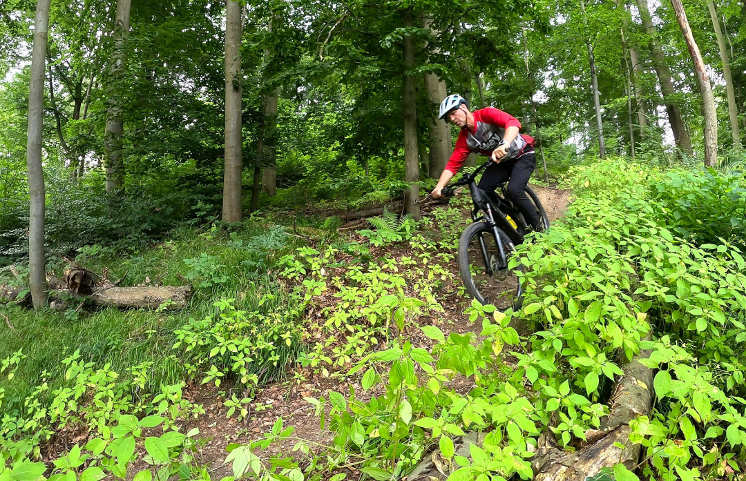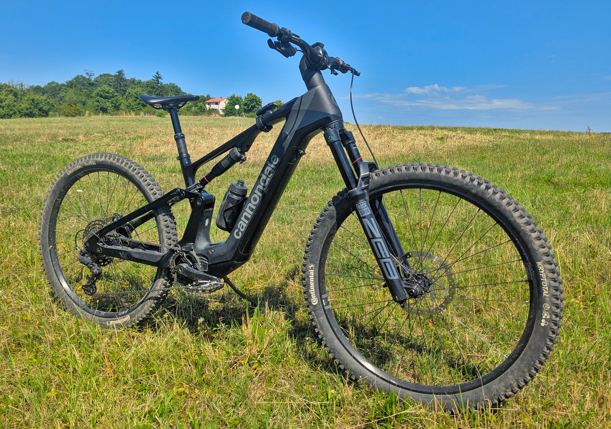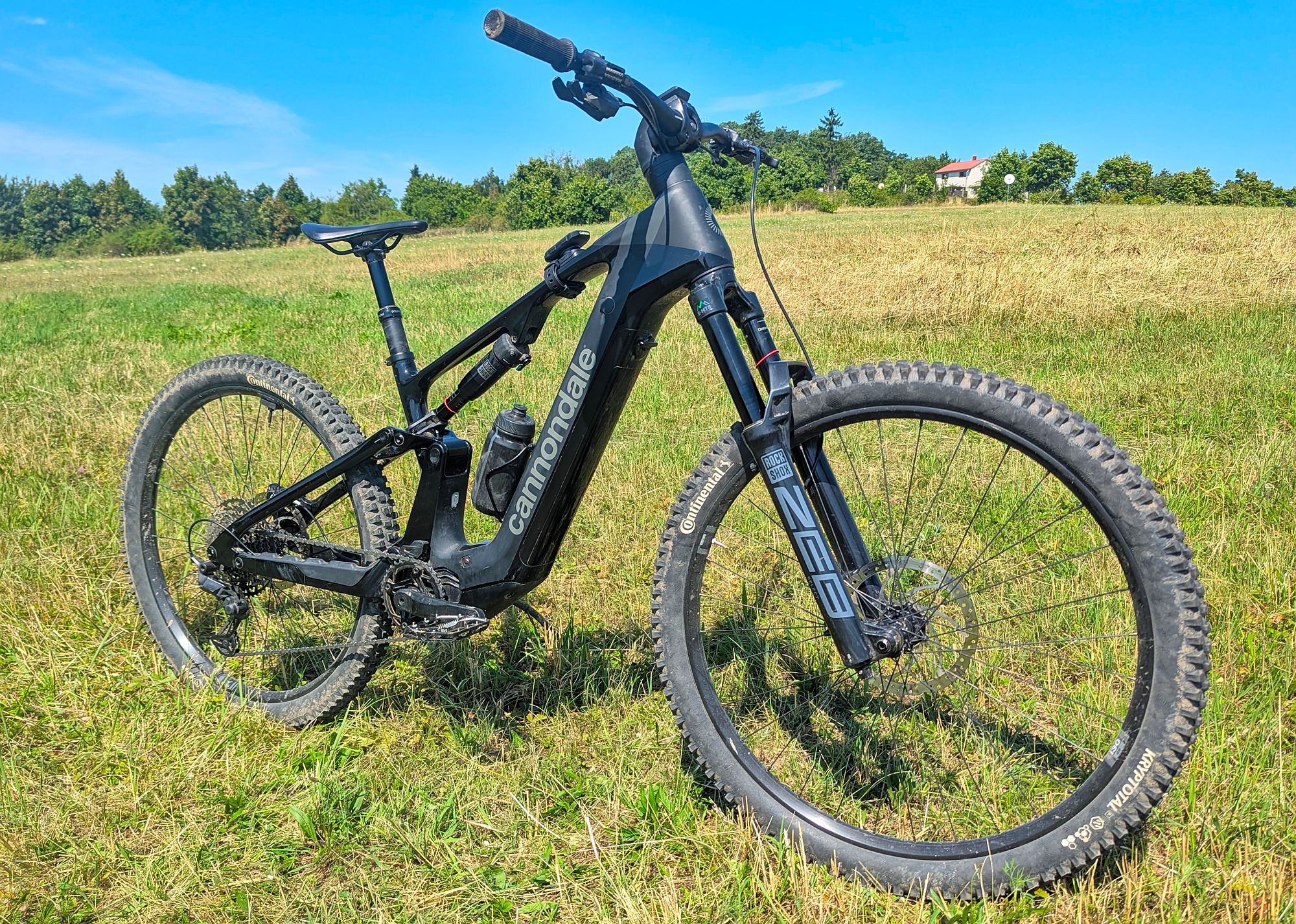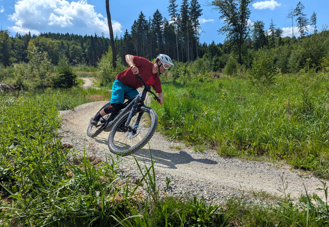 Výše zmíněné platí při cestě dolů, ve výjezdech za delší zadní budeš děkovat, ani v extrémně prudkém terénu nemá kolo tendence vzpouzet se na zadní. "Velké" zadní kolo obuté - stejně jako přední - do plášťů Continental Kryptotal, poskytuje skvělou trakci.