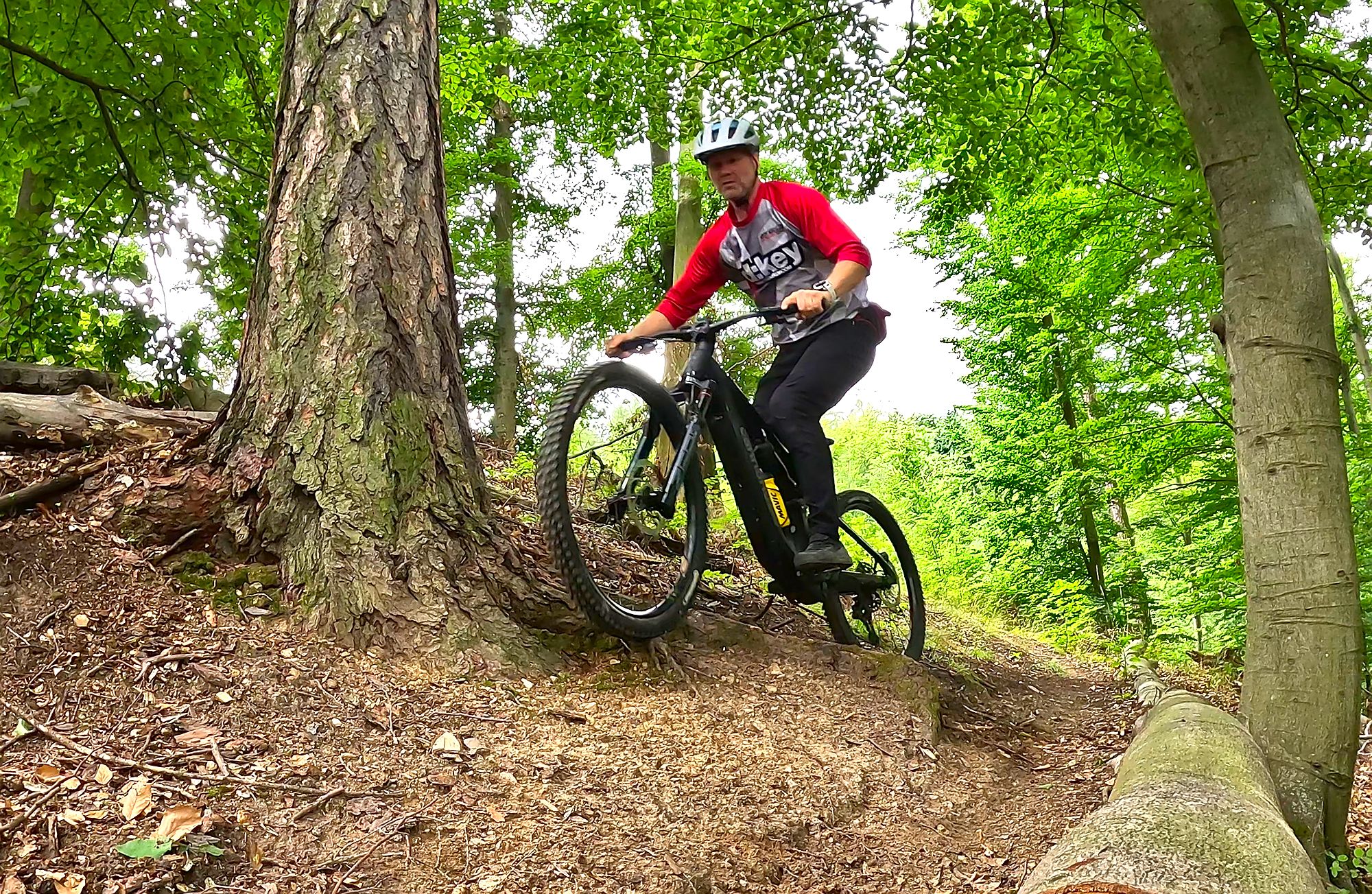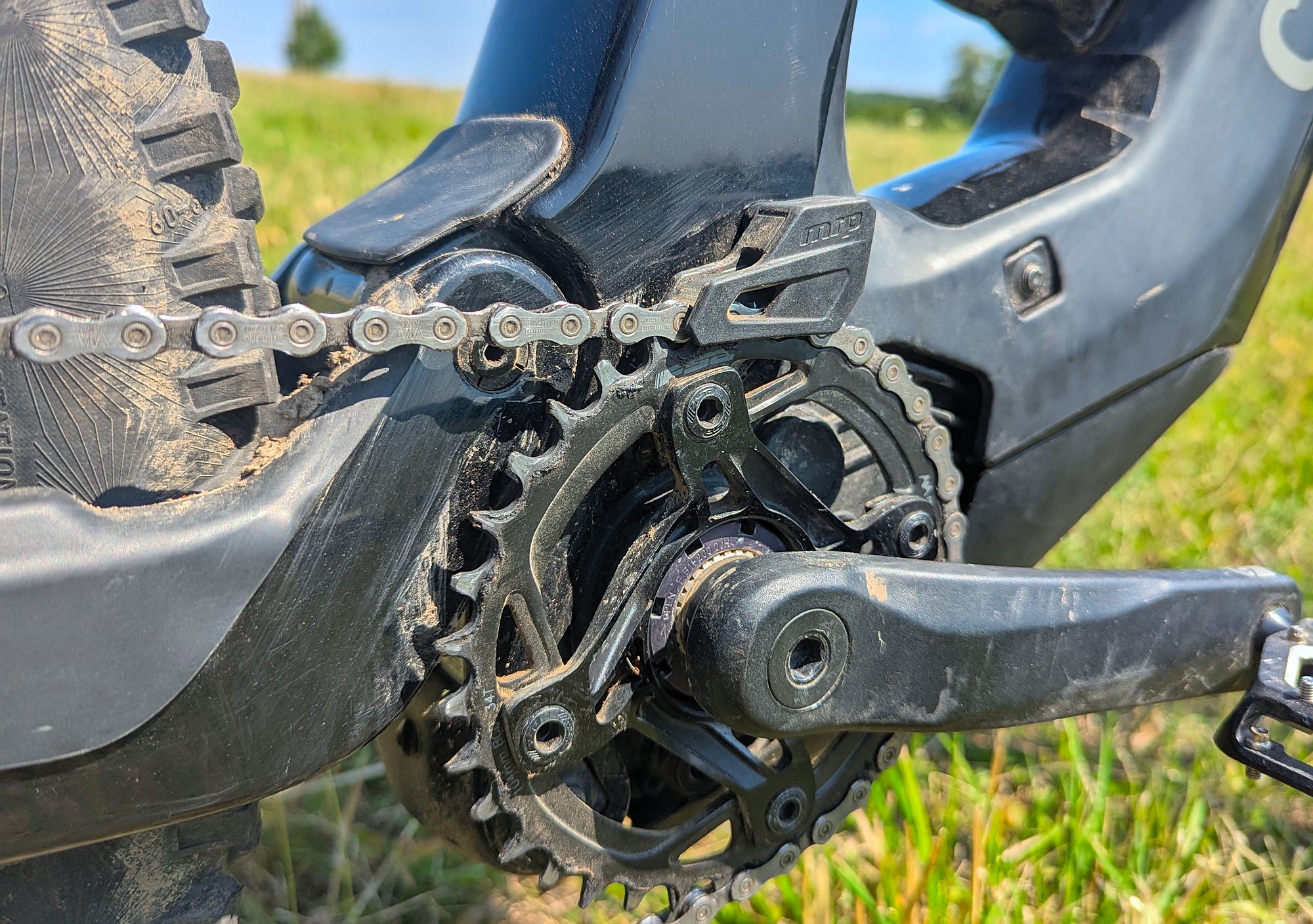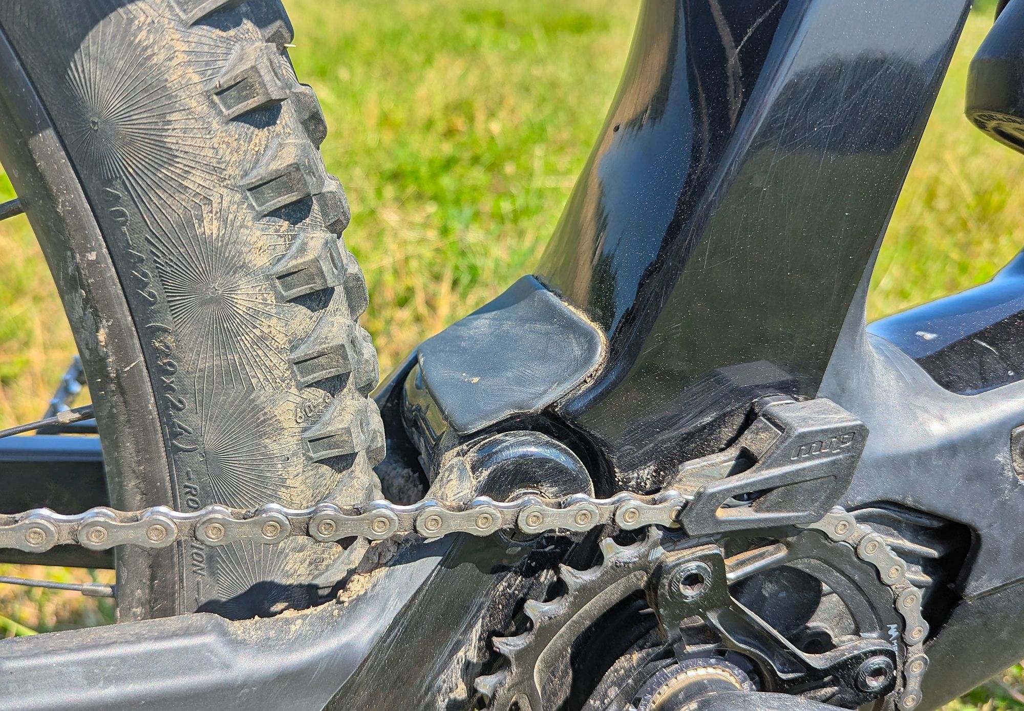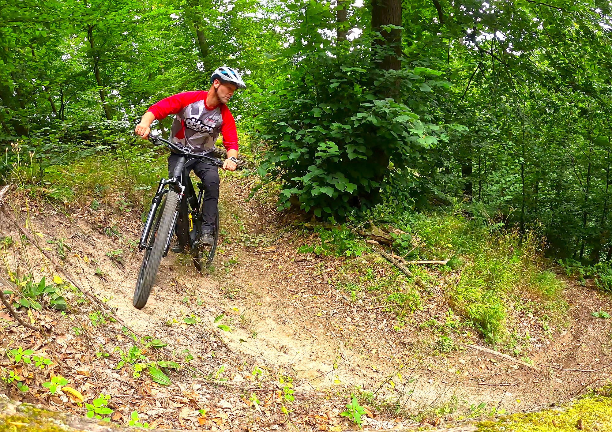 Výše zmíněné platí při cestě dolů, ve výjezdech za delší zadní budeš děkovat, ani v extrémně prudkém terénu nemá kolo tendence vzpouzet se na zadní. "Velké" zadní kolo obuté - stejně jako přední - do plášťů Continental Kryptotal, poskytuje skvělou trakci.