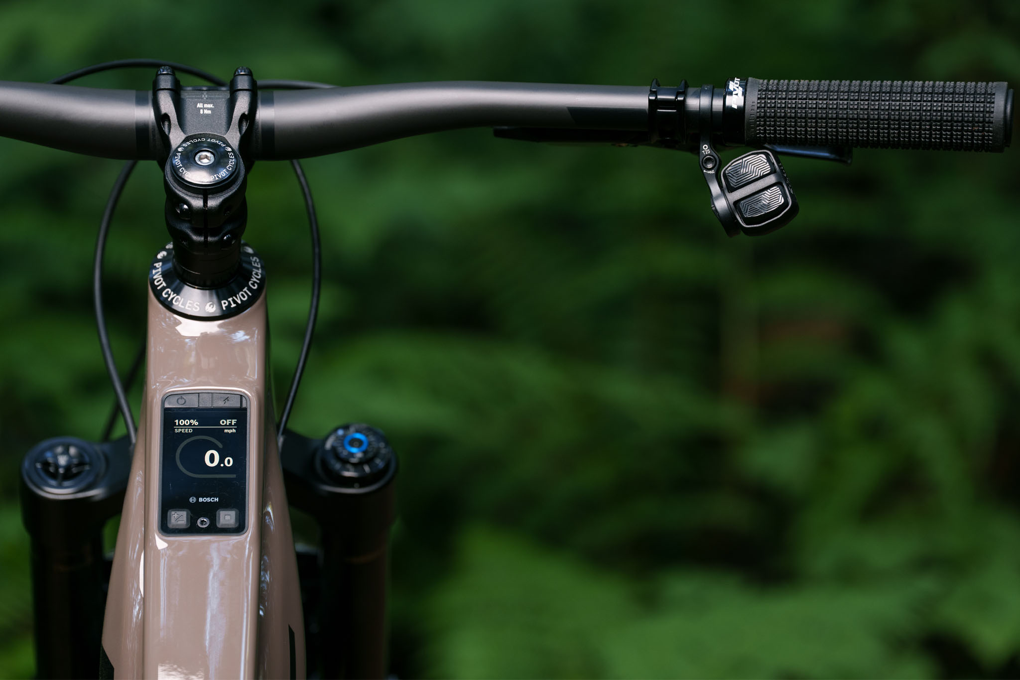 Elegantní bezdrátové ovládání Bosch. Bezdrátová řadicí páka Sram (TEAM a PRO) a gripy Phoenix Factory Lock-On na karbonových řídítkách Phoenix Factory Tuned-Flex,