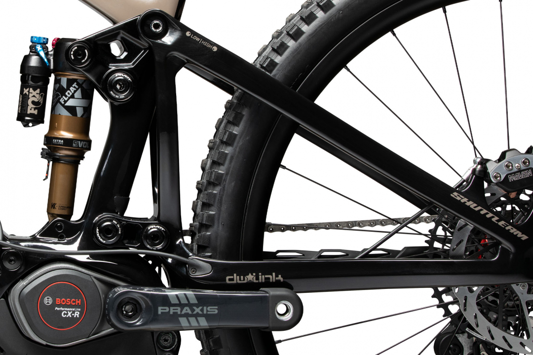 Shuttle AM má zdvih 160 mm vpředu a 150 mm vzadu. Specifikace TEAM je vybavena tlumičem Fox Factory Float X a vidlicí Fox Factory Grip X2 36.