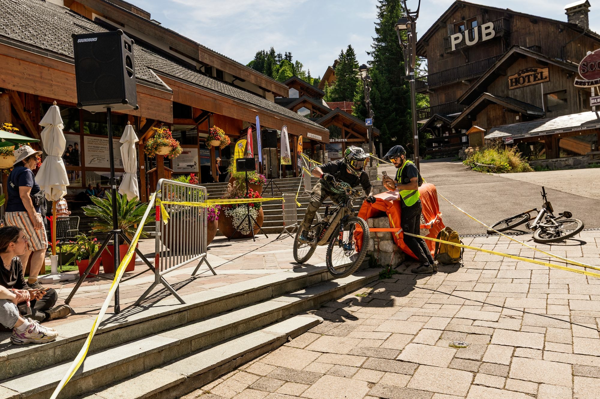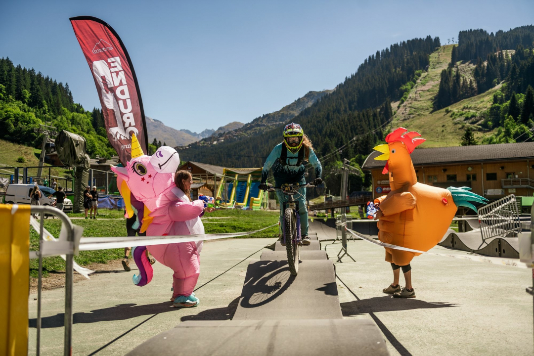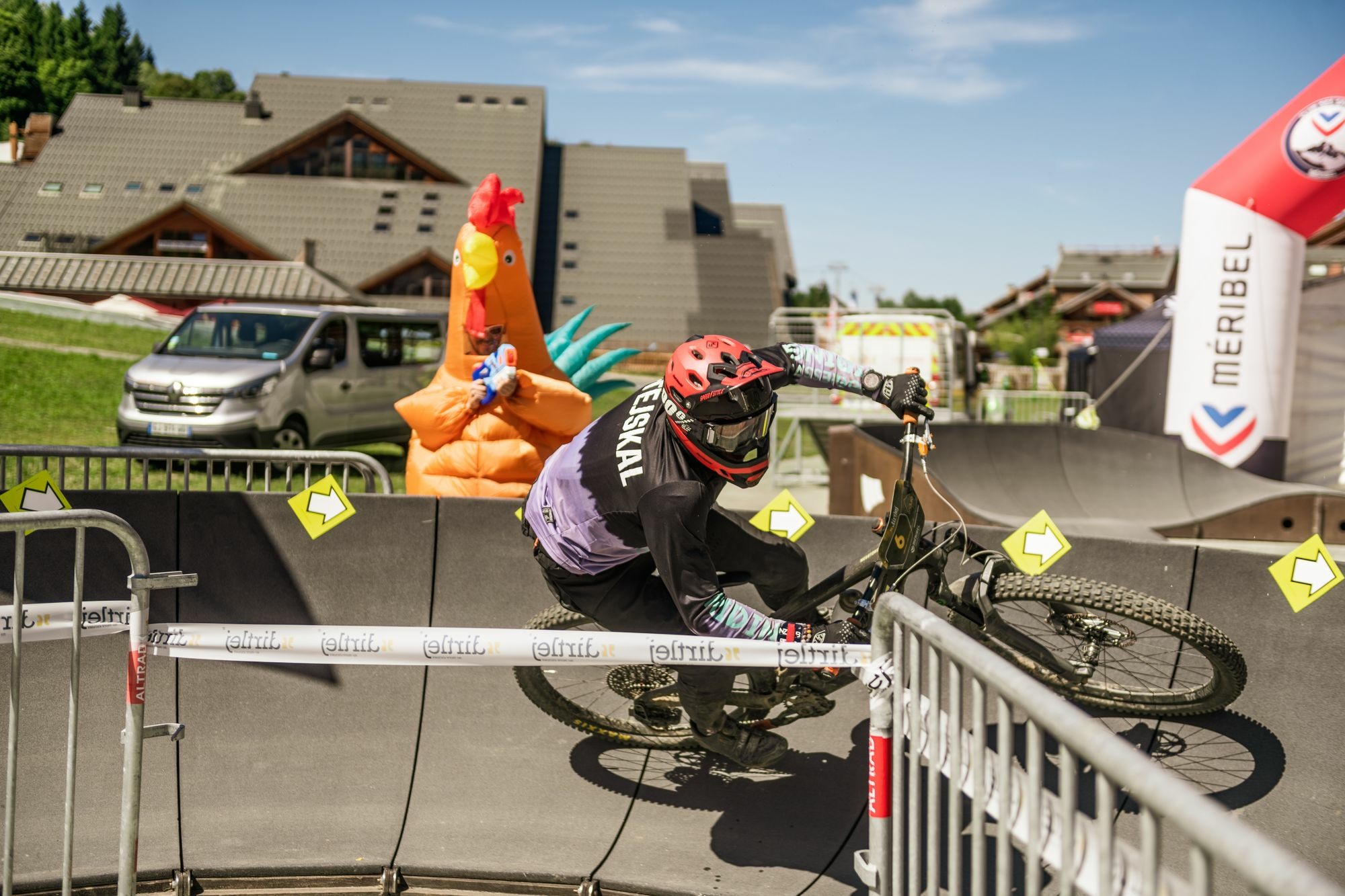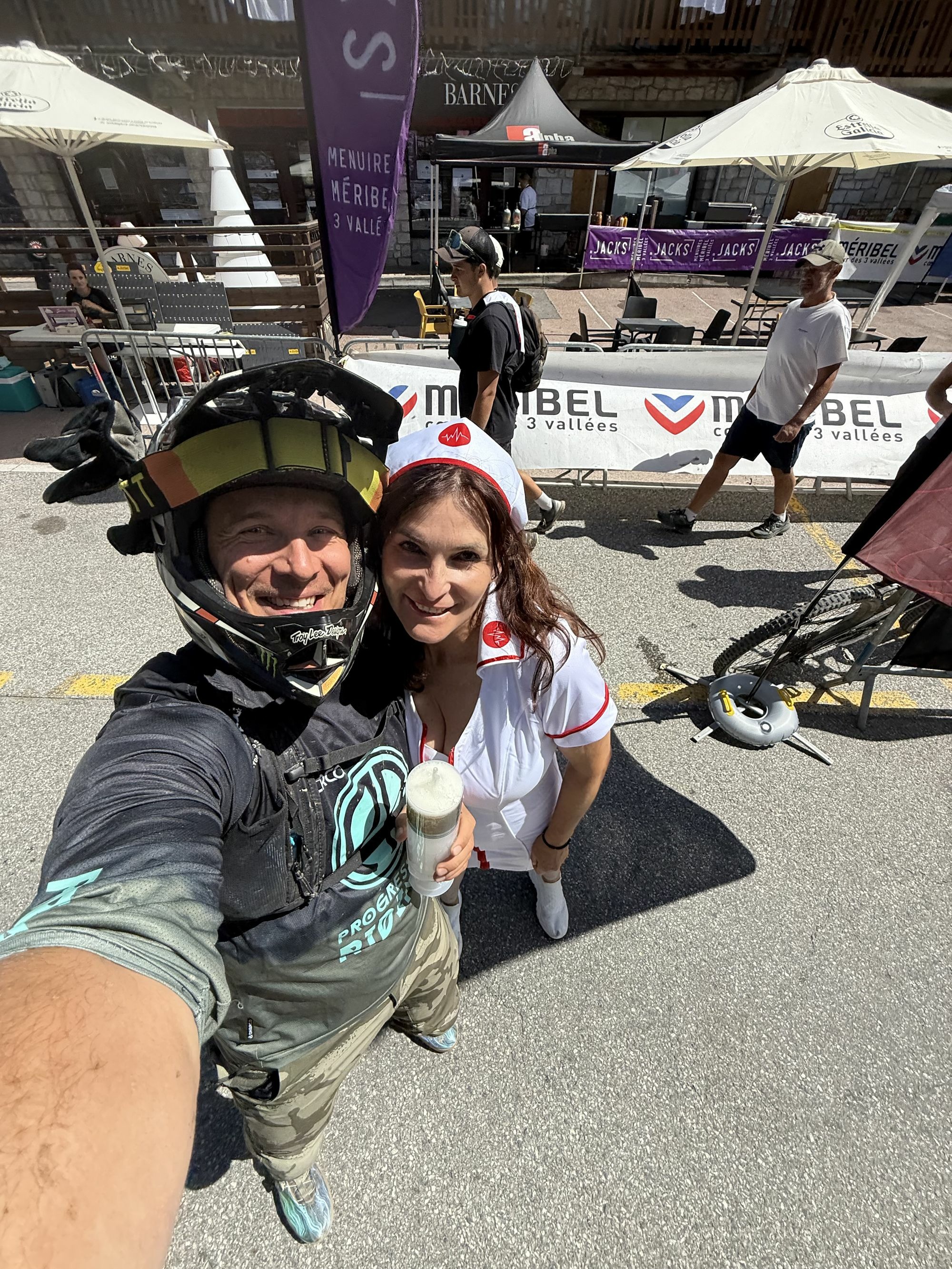 Na štart poslednej RZty čakáme asi pol hodinu než sa vôbec štart otvorí. To nám ale nevadí, lebo slnko svieti, my máme možnosť relaxovat a čaká nás RZeta, ktorá sľubuje epesný zážitok jak pre jazdcov, tak pre divákov. Prvá časť v bikeparku sa potom napája na Urban Downhill cez malebné mestečko Meribel. RZeta relatívne krátka a môj šálok kávy, takže si to užívam. Zbynďa tomu dáva maximum. Až sa skoro rozmontoval na drobné pri skoku na placku z jedných schodov. Pobozkal svoj predný plášť pre štastie ale ako zázrakom sa udržal na bicykli aby ma mohol docvaknúť do cieľa. Finish, hotovo, sestřička s koňskou striekačkou piva nás odpípne v cieli a my si môžme konečne vydýchnuť. Alebo umriet.