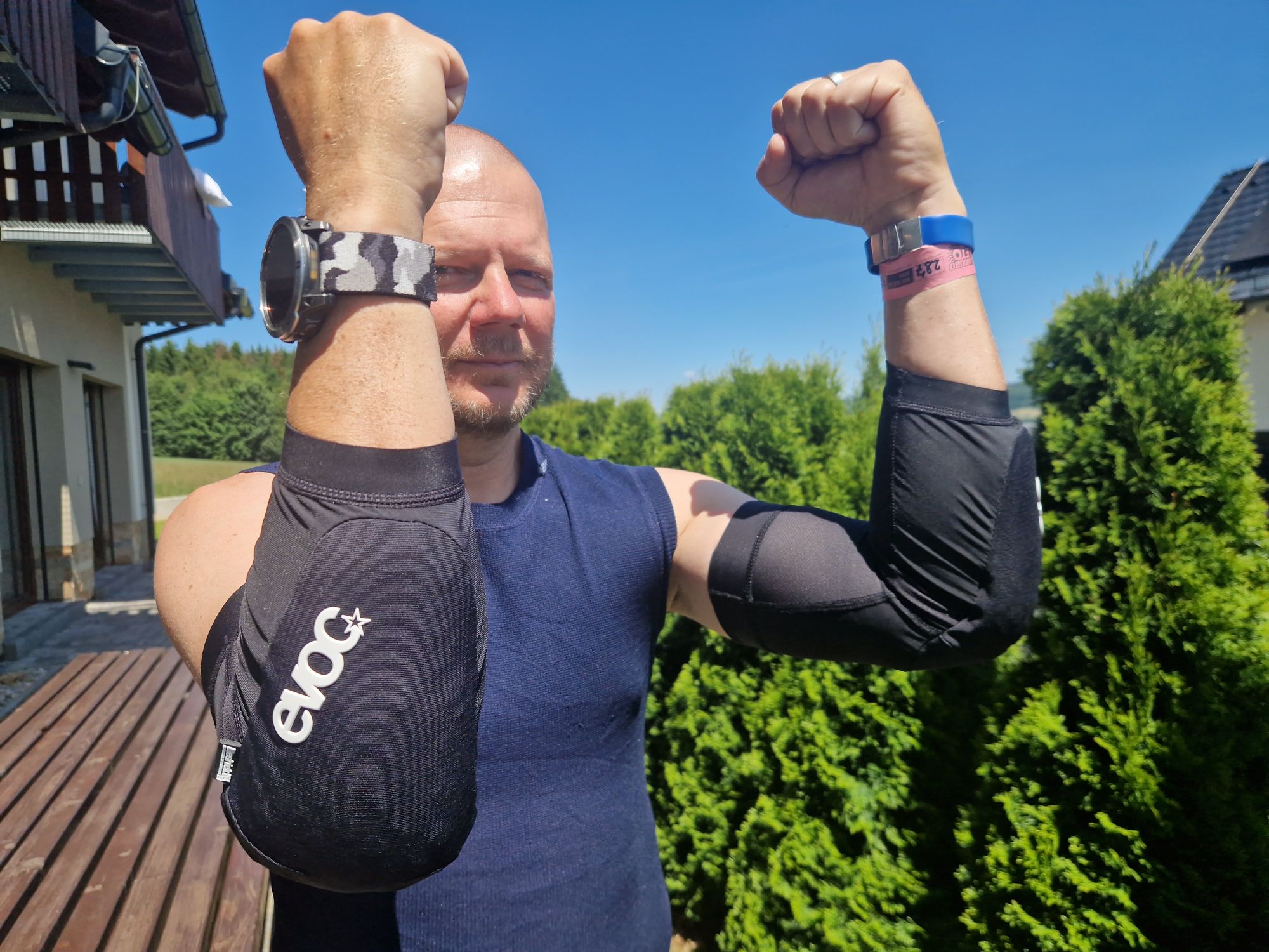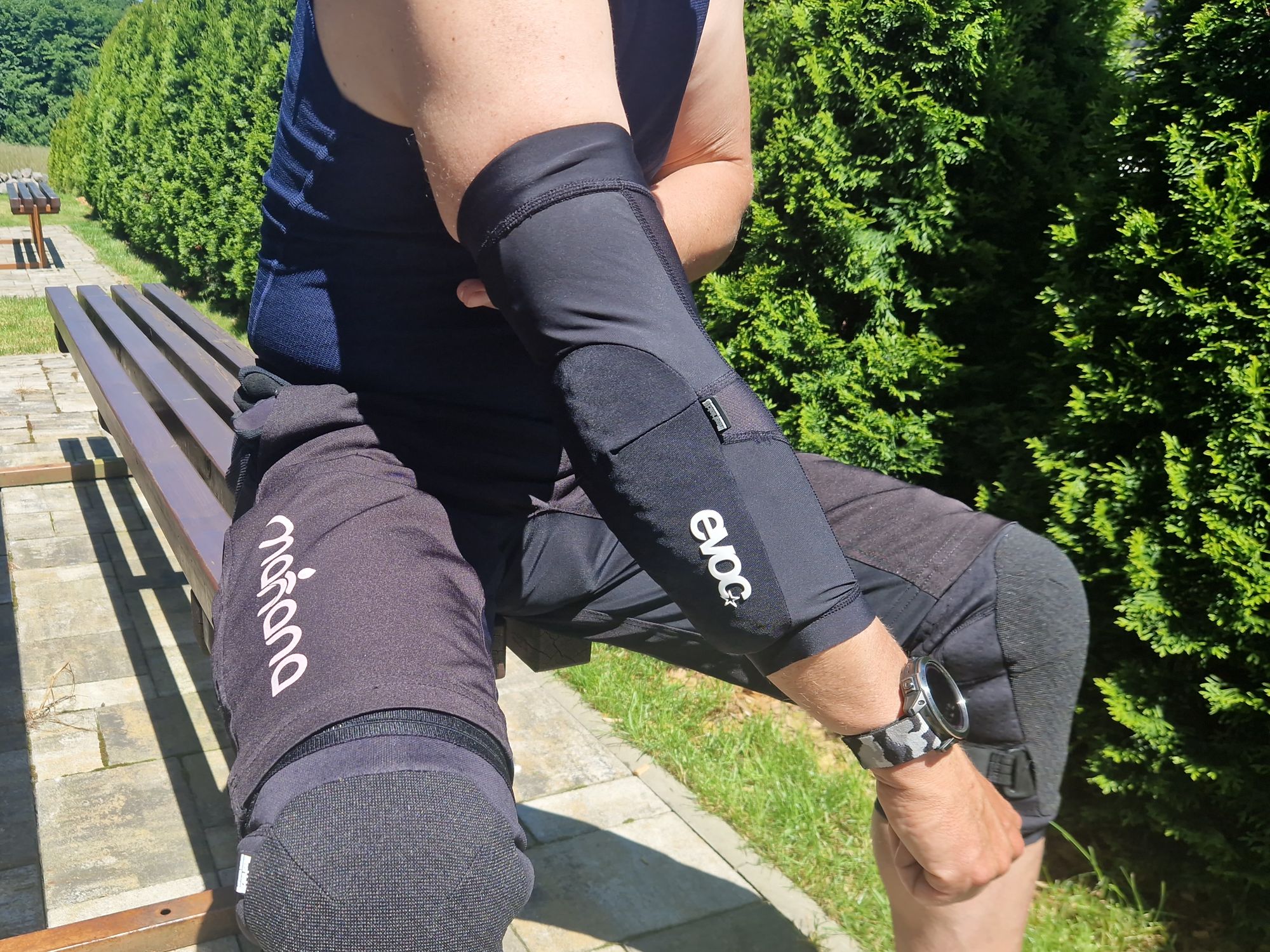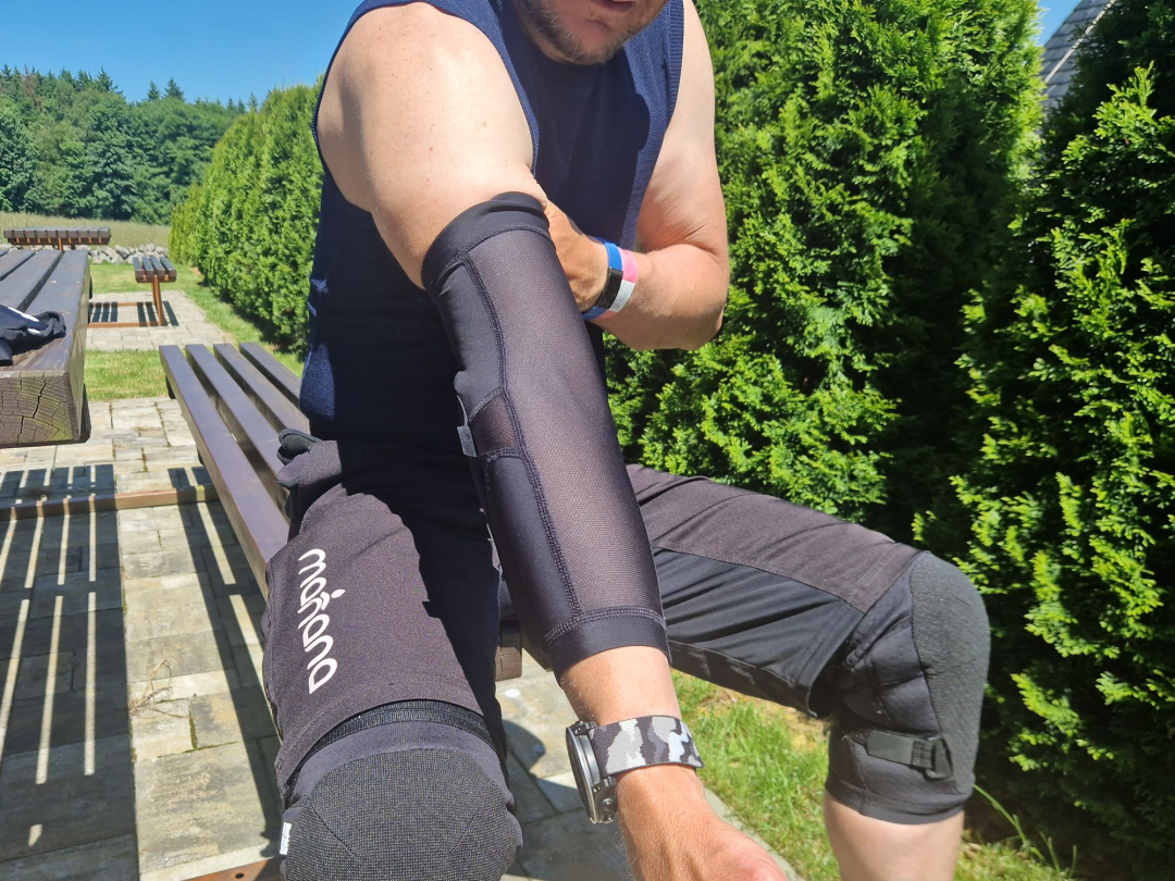 To stejné můžu s klidným svědomím říct i loktech. 240 gramů lehké jednoduché loketní chrániče, které stačí jen natáhnout a hotovo. Silikonové pásky zajišťují jejich pozici po celý den. Velikost mi tentokrát sedí lépe. Chránič měří 35 cm, což mi při nasazování přijde hodně. Ale jak jsi najde své místo, tak díky zanedbatelné váze a slušnému odvětrání na ně zapomínám a sundávám je opravu až dojezdím.