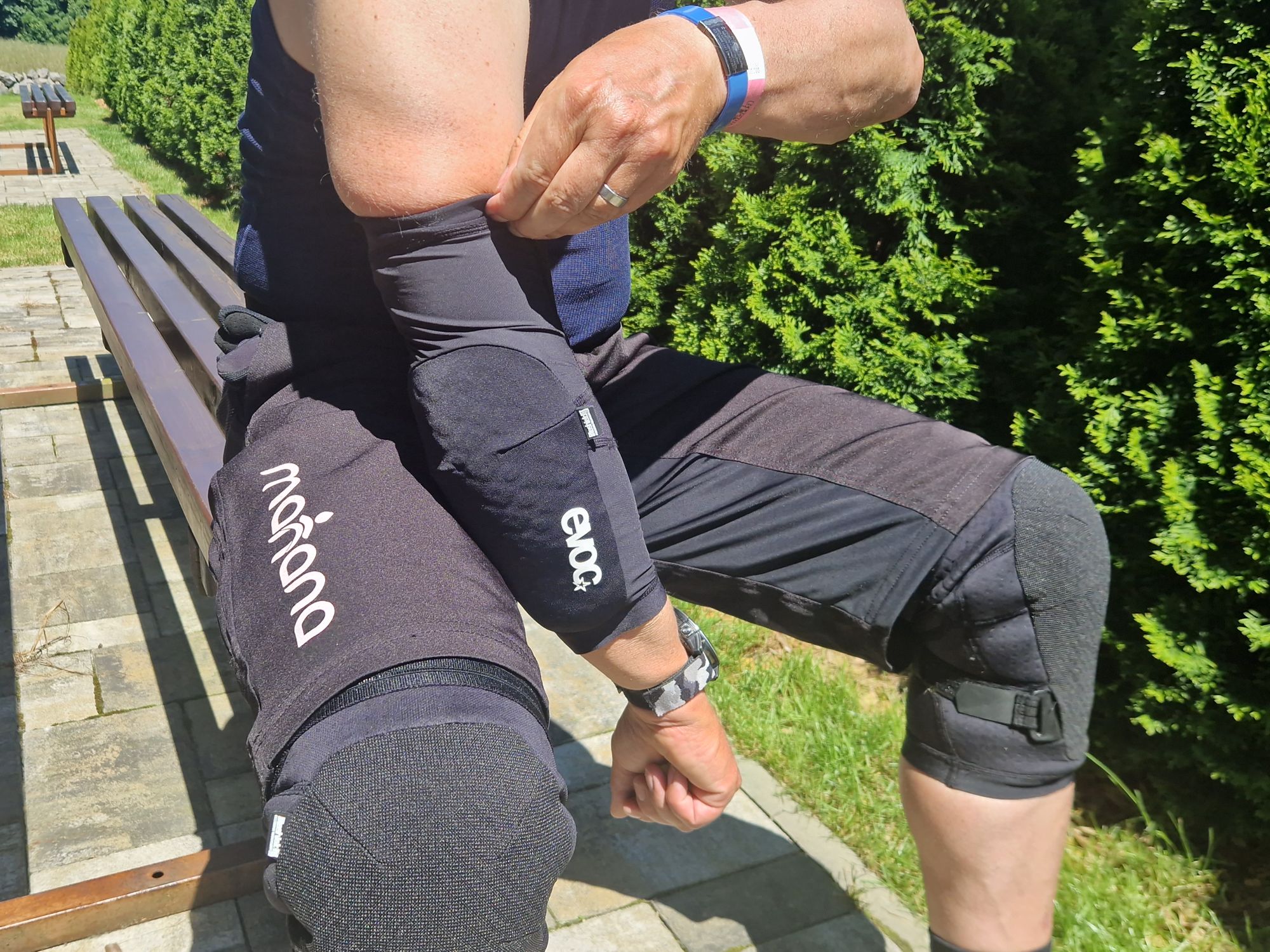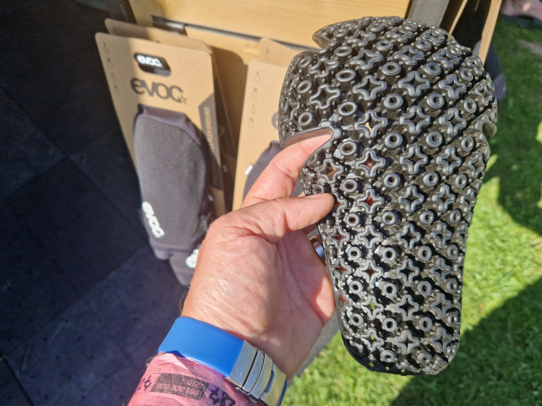 Já vybíral ve stánku bikeaction.cz. Shodou okolností jsme tam stáli společně s Frantou Žilákem nad dvěma variantami Evoc PROTECTOR LS. Zatímco Franta na kolena zvolil verzi LITE, já šáhl po verzi ENDURO. Na lokty beru také verzi LITE, ať mohu porovnat. Název a pár operací kolen mi jasně říká proč. Delší (39 cm), robustní a s polstrováním i z boku = ochrana úrovně Level 2 dle normy EN 1621-1. Váha necelého půl kila, to už musí něco vydržet. Na stánku mám možnost si prozkoumat i vnitřní výplň, která se stará u tlumení nárazů. Materiál Airprene je gumový, měkčí, vysoký cca 1 cm. Mřížka je kombinací hvězdiček a kroužků, ve kterých jsou dírky pro lepší odvětrání. Vpředu je chránič pokryt odolnou kordurou, zezadu lehčí síťovinou. Zajištění na místě mají na starosti dva pružné pásky nad a pod kolenem doplněné trojicí suchých zipů (nahoře jeden, dole dva), díky čemuž je zajištěná dostatečná možnost pohodlného dotažené. Navíc jsou z vnitřní strany i silikonové pásky, tak nemusíte chránič dotahovat tak na fest.