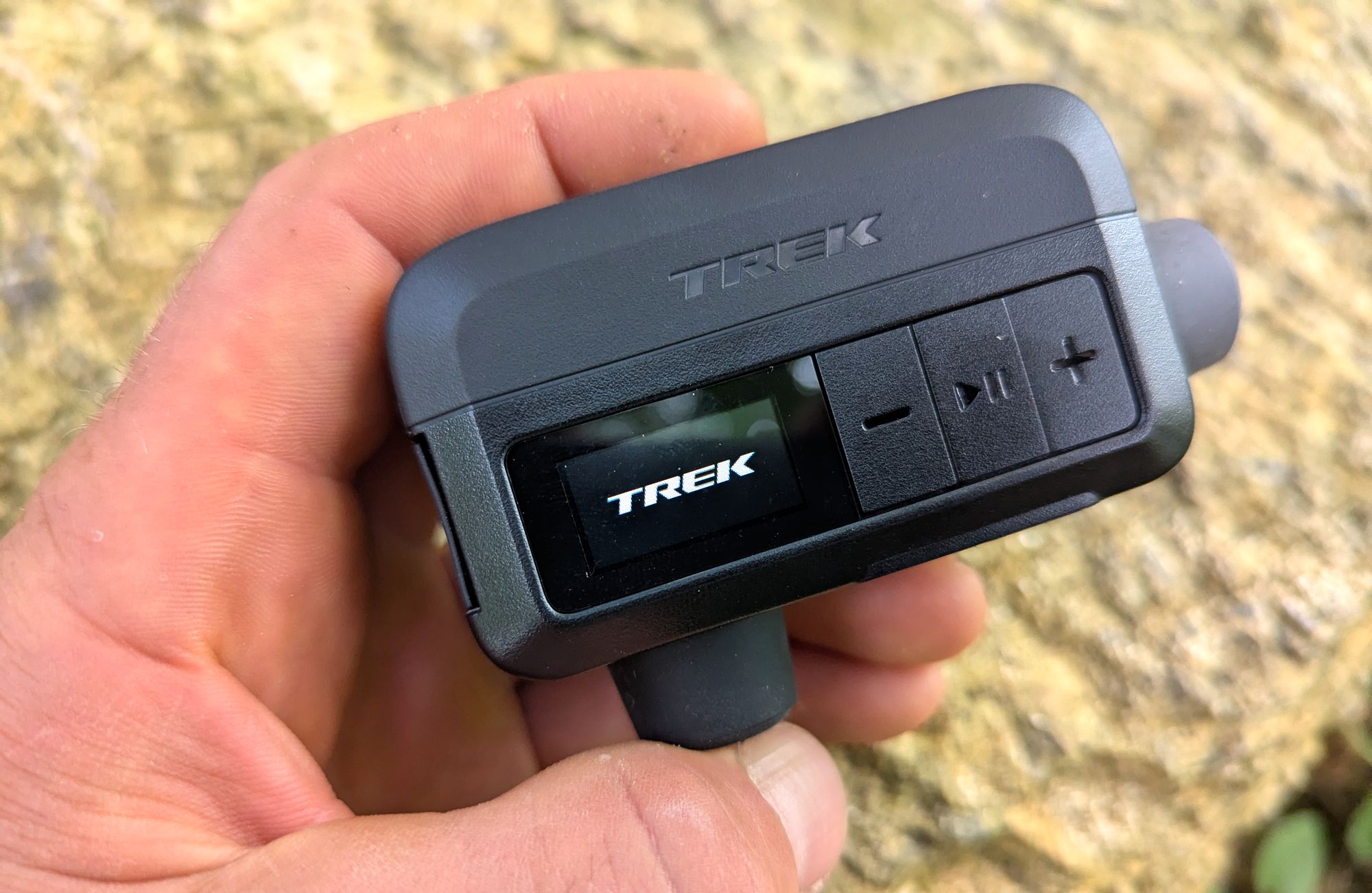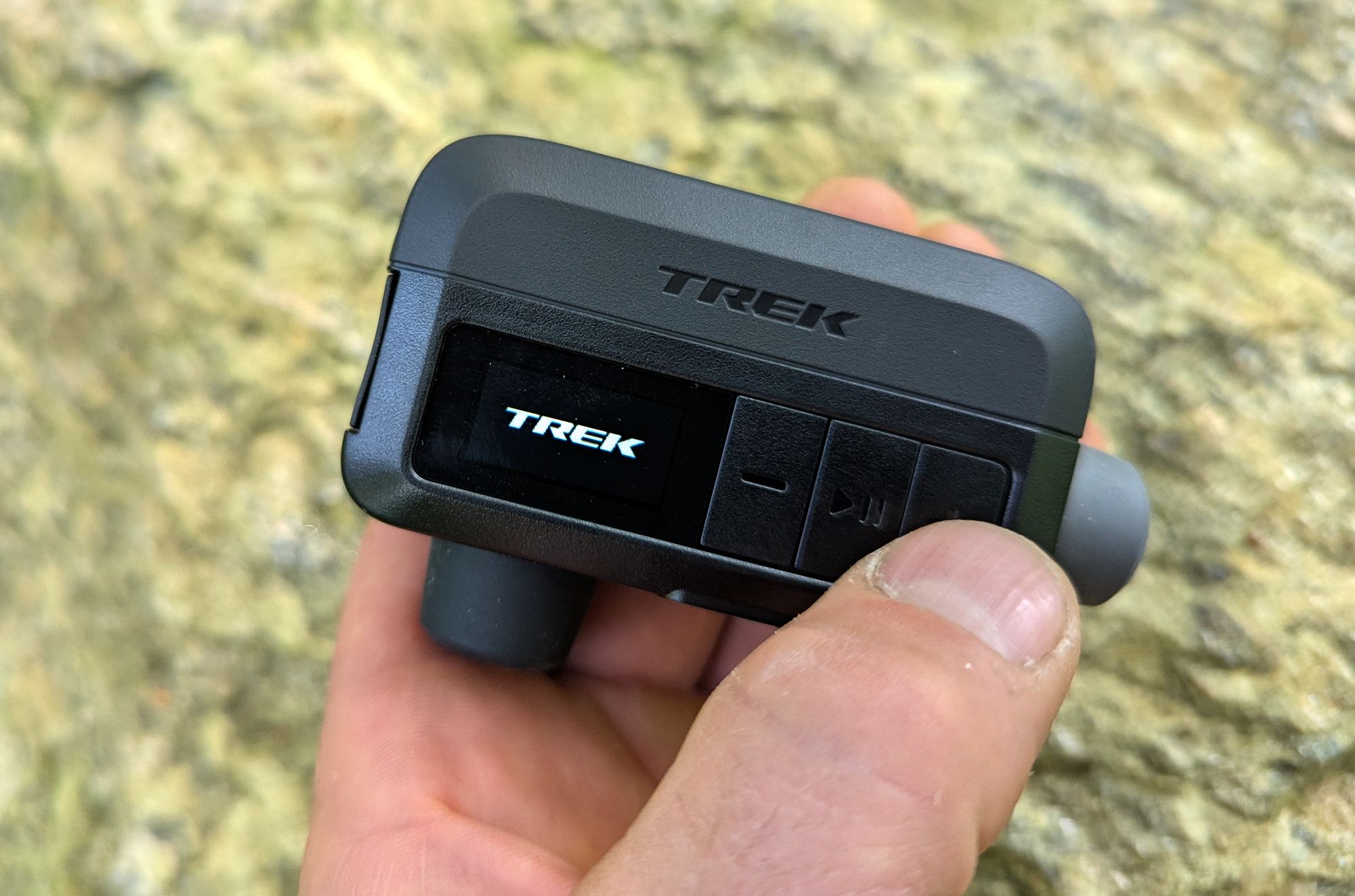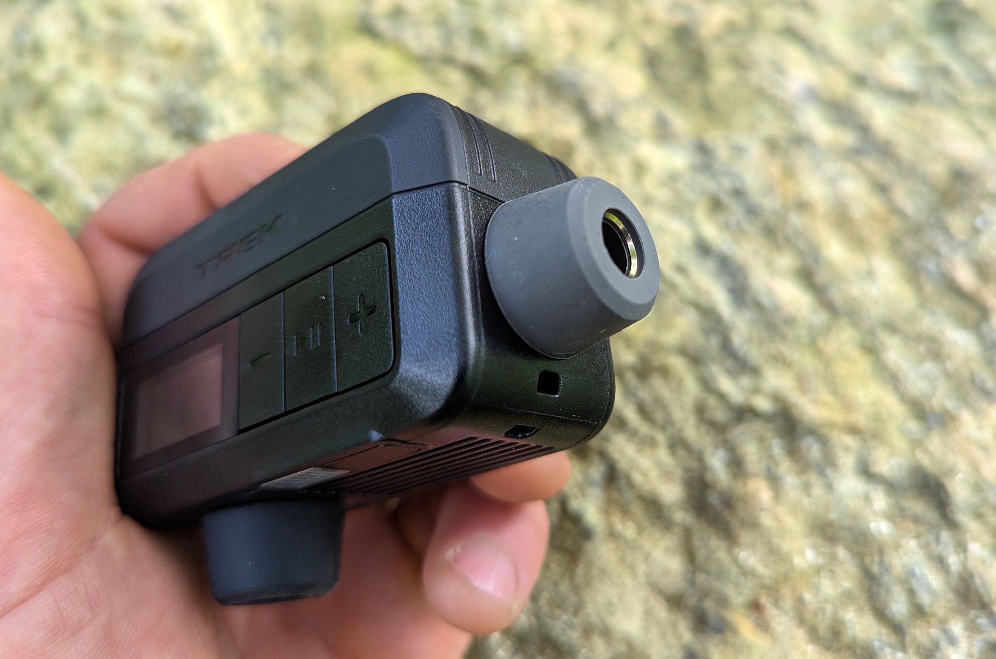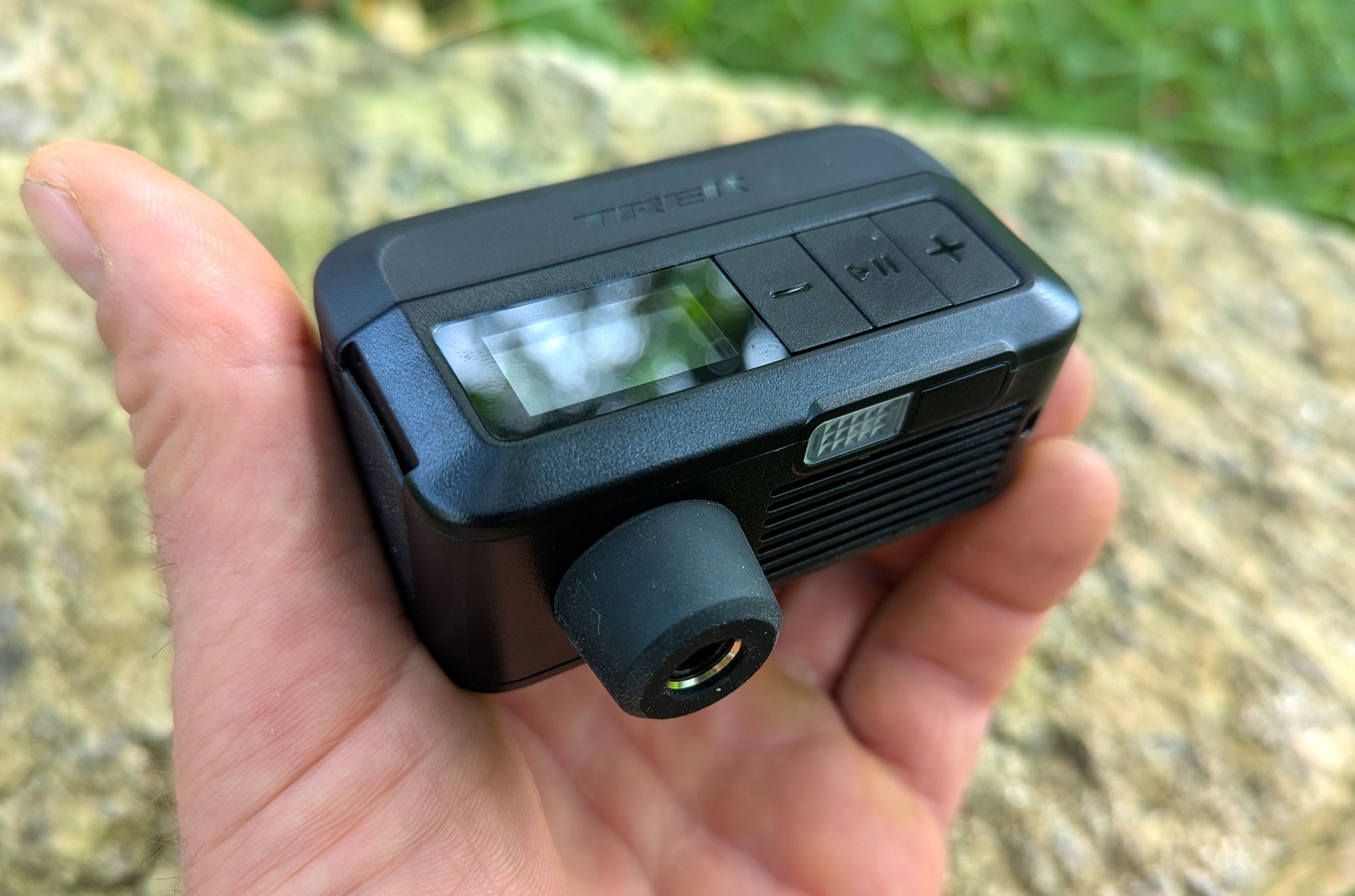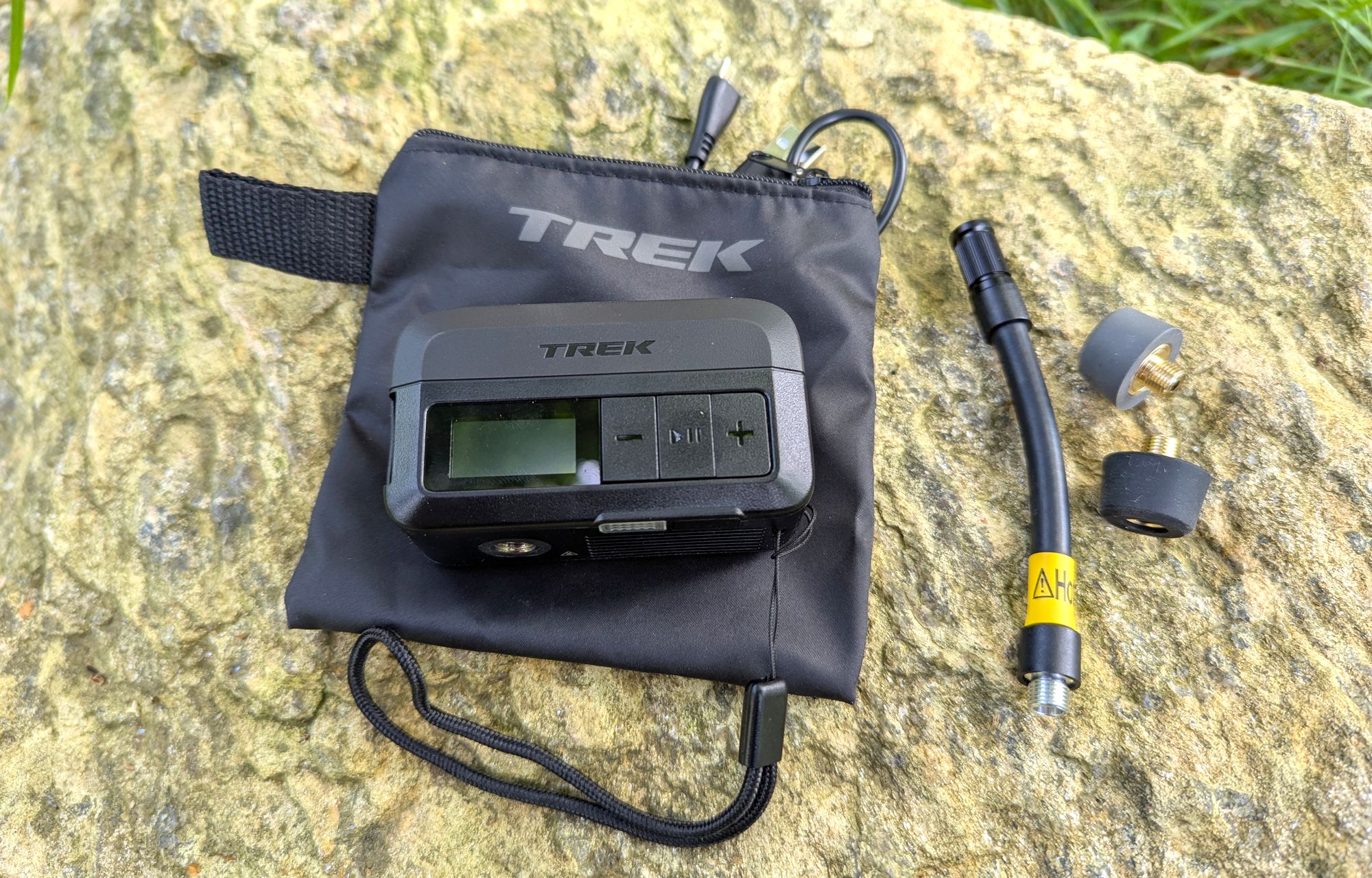 Přední straně dominuje nápis Trek a barevný displej a trojice tlačítek. Naspodu se nachází závit pro namontování koncovky ventilku vedle něj Trek umístil led světýtko s tlačítkem na jeho zapnutí/vypnutí. Na pravém boku najdeme další závitovou dír, do níž lze umístit druhou koncovku, to v případě, že byste pumpičku vozili samostatně bez použití dodávaného pytlíčku. Součástí balení je i prodlužovací hadice a jehla na nafukování míčů.