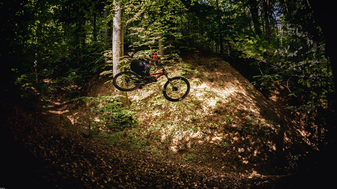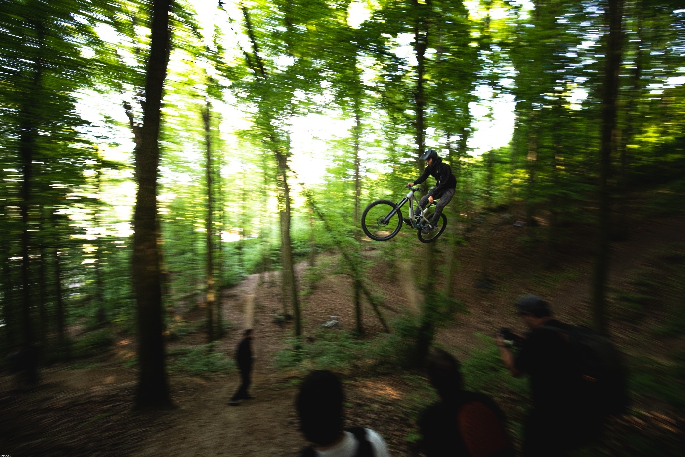 To co tam je ukrytýho v lese, to je doslova úlet! Spousta odpalů spousta dopadů, ale když ti pak dojde, z jaký bábovky letíš na jakou bábovku... jak řikám úlet! Malá lajna - skoky do 8m, velká lajna skoky 8-10 a pak "zbytek" vše nad 10m. Malá lajnička je v klídku, po půl hodině přecházíme na velkou lajnu. Jezdí se velká, ale čas tlačí, únava útočí. Kluci tam ještě vyzívaj alternativu do malý lajny, která má dobrejch 16m, vysílák mezi stromy, párkrát byl slyšet doraz ,ale nikdo nespadnul. Jde se na "malý" step up, rozjezd přes půl lesa, proporce čtrnáct daleko a dva nahoru, odradí i pár zkušených kovbojů.