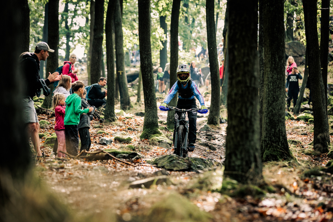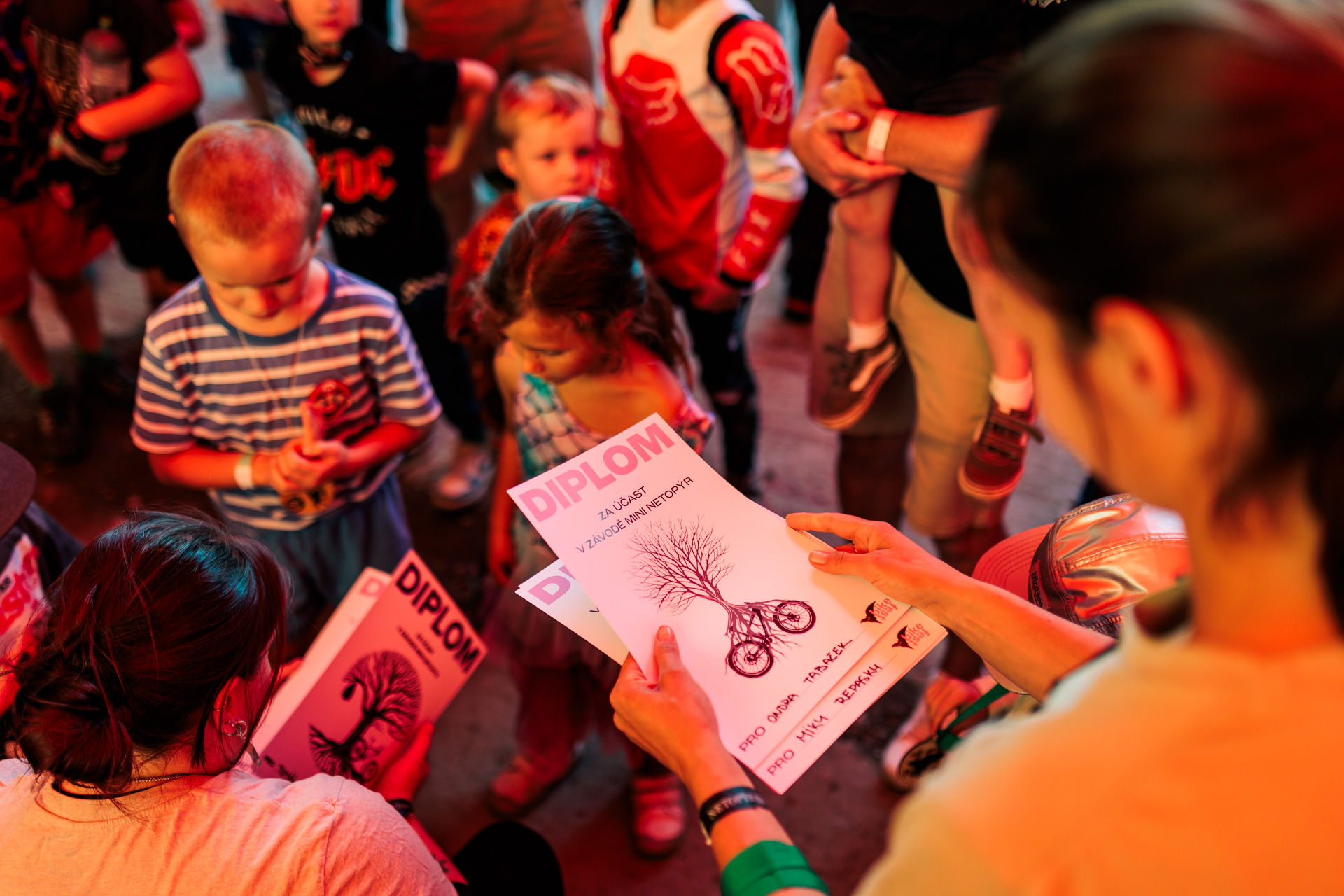 Co nás těší úplně nejvíc, je počet dětí. Letos se k závodům přihlásil rekordní počet špuntů, číslo se blížilo stovce a to už je fakt mazec. Je radost sledovat, jak se malí rideři rok od roku posouvají - ti, co kdysi začínali na pumptracku a s odřenýma ušima dojeli první kolo, se letos střemhlav vrhali i do nejtěžší tratě, nechvalně proslulého netopýrského déháčka. A to je přesně to, proč tuhle akci děláme - tradice, progres, radost z kola.