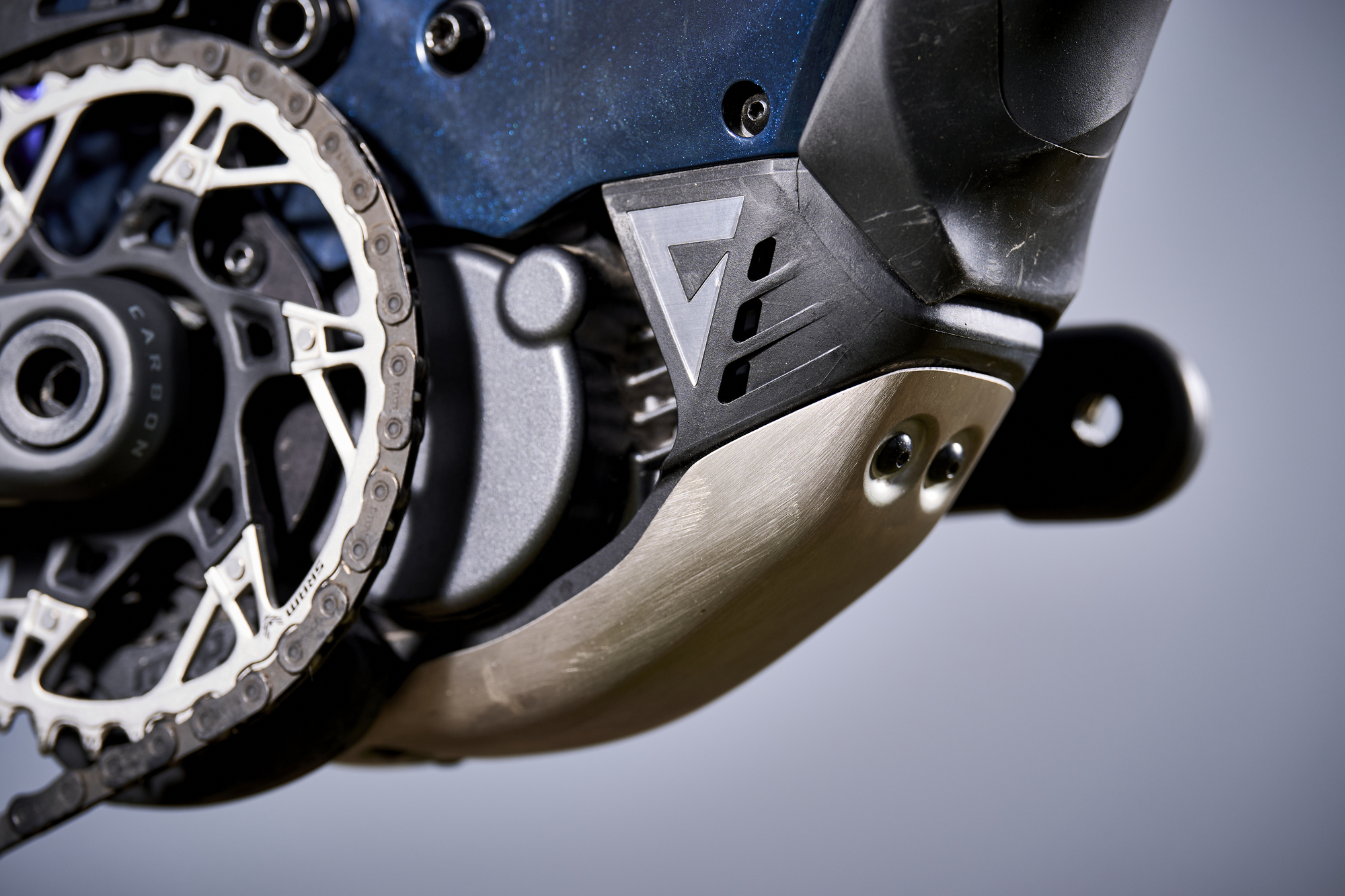 Pro ochranu převodníku a řetězu se Giant obrátil na specialisty z MRP a společně vytvořili první aktivní bash guard. Má odpružený design a elastomerový tlumič, který absorbuje veškeré nárazy a pomáhá tak chránit motor a rám.
