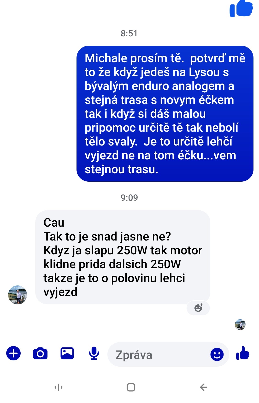Gabosh 8.10.2025 - 12:20Já se o tom nebudu přít... Ale myslím, že by stačil test, kdybys jel třikrát s éčkem na Lysou a já jen jedou s tím těžkým analogem enduro s širokými DH plášti. A nedělali bychom fyzicky nic jiného, než toto cca 3x týdně po dobu jednoho měsíce. Troufám si tvrdit (záleží taky na nastavení člověka a jeho tvorbě svalů, což mám bohužel extrémní, takže asi nejsem nejlepší příklad :)..), ale stejně: ty stehna bych měla větší než ty i jako ženská :):)...Ale - ty bys byl vytrvalostně na tom na 100% lépe. Tak jako to mají kulturisté - vytrvalostní běžci "křováci" z nich asi nebudou.... A jestli vzýváš Pepu Dresslera, kterého Trek živí a sponzoruje, takže musí prodat a přesně jeho cílovkou jsou bohatí lidé nad 40 let. Tak to asi není relevantní příklad. Můj brácha se živí jako robotik strojař a marketing má u zádele, takže řekne pravdu. A ano je s éčkem maximálně spokojený...to nikdo nikomu nebere. :) Ale stojím si za tím, co mě napsal jako majitel éčka, který nemá známky "kultu" ;)