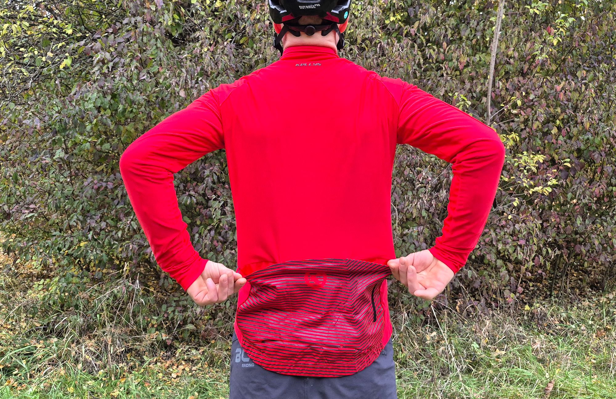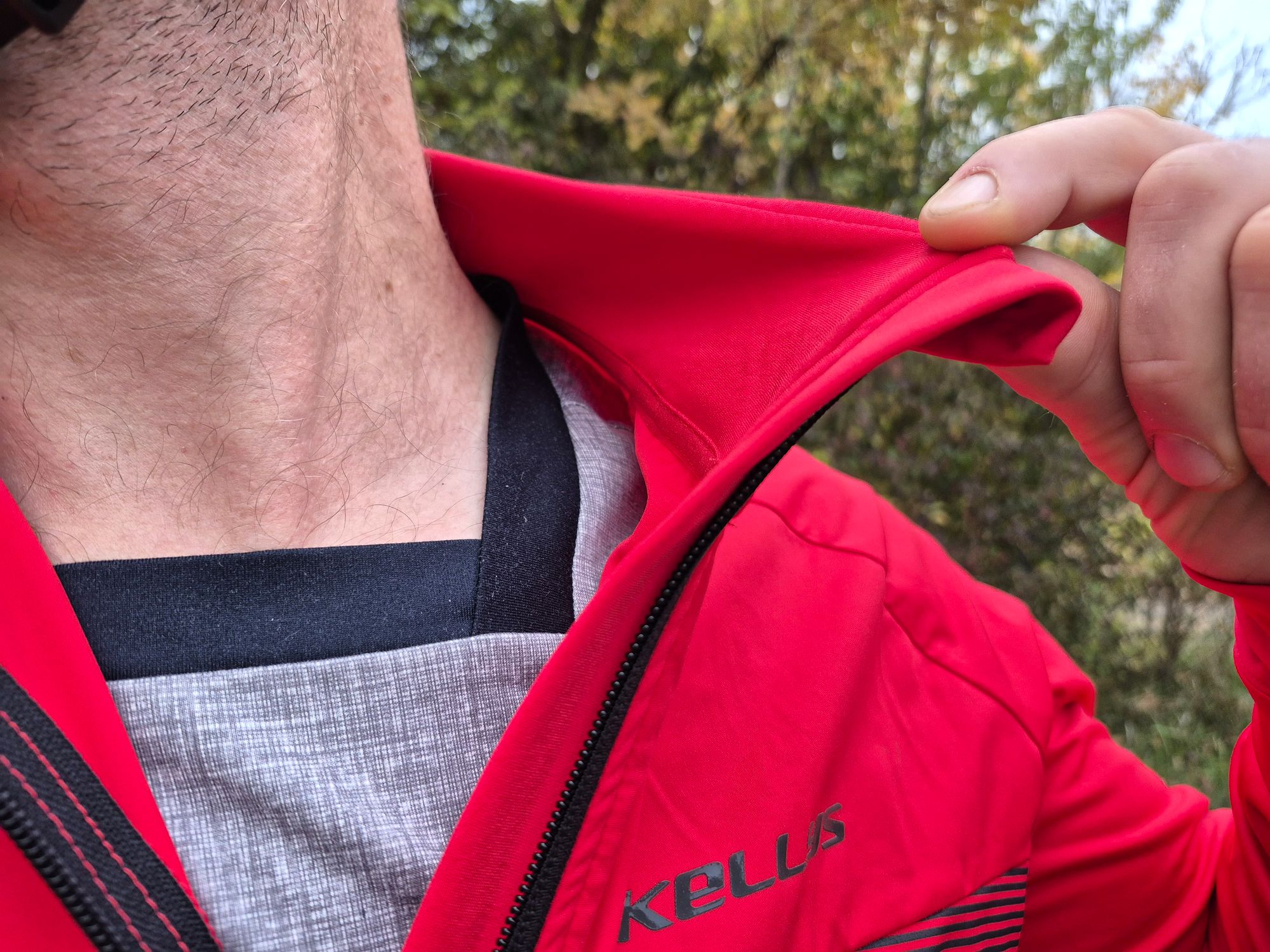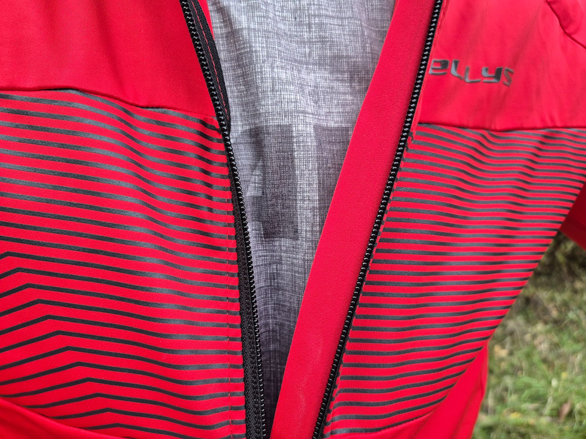 Celopropínací zip bych se jako high tech označit neodvážil, ale díky vnitřnímu překrytí skrze něj do bundy nefouká. Celá přední strana a přední i horní stran rukávů je ušita z neprofuku, zbytek již ne. Toto řešení mi přijde super, studený vzduch se při jízdě k tělu nedostane a odvětrání zad prodyšnější látkou zabrání pocení. I když Kellys nepoužil žádnou membránu, spojení neprofouknutelné přední a větrací zadní části funguje bezvadně, a ani já, extrémně potící se jezdec neměl sebemenší pocit nekomfortu.