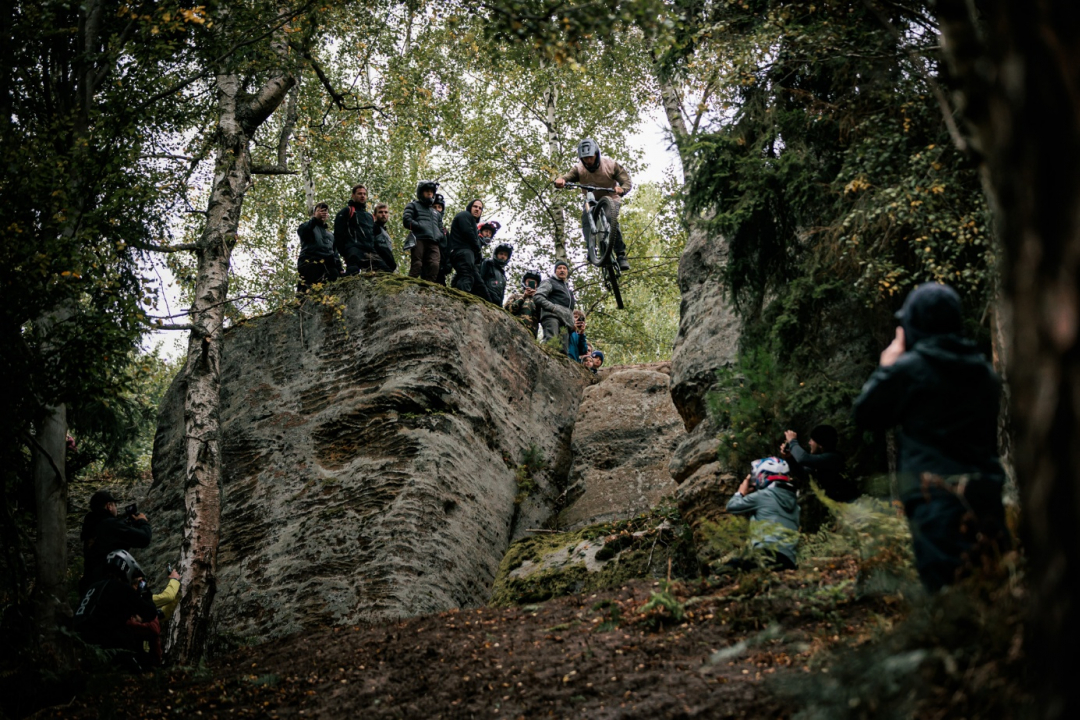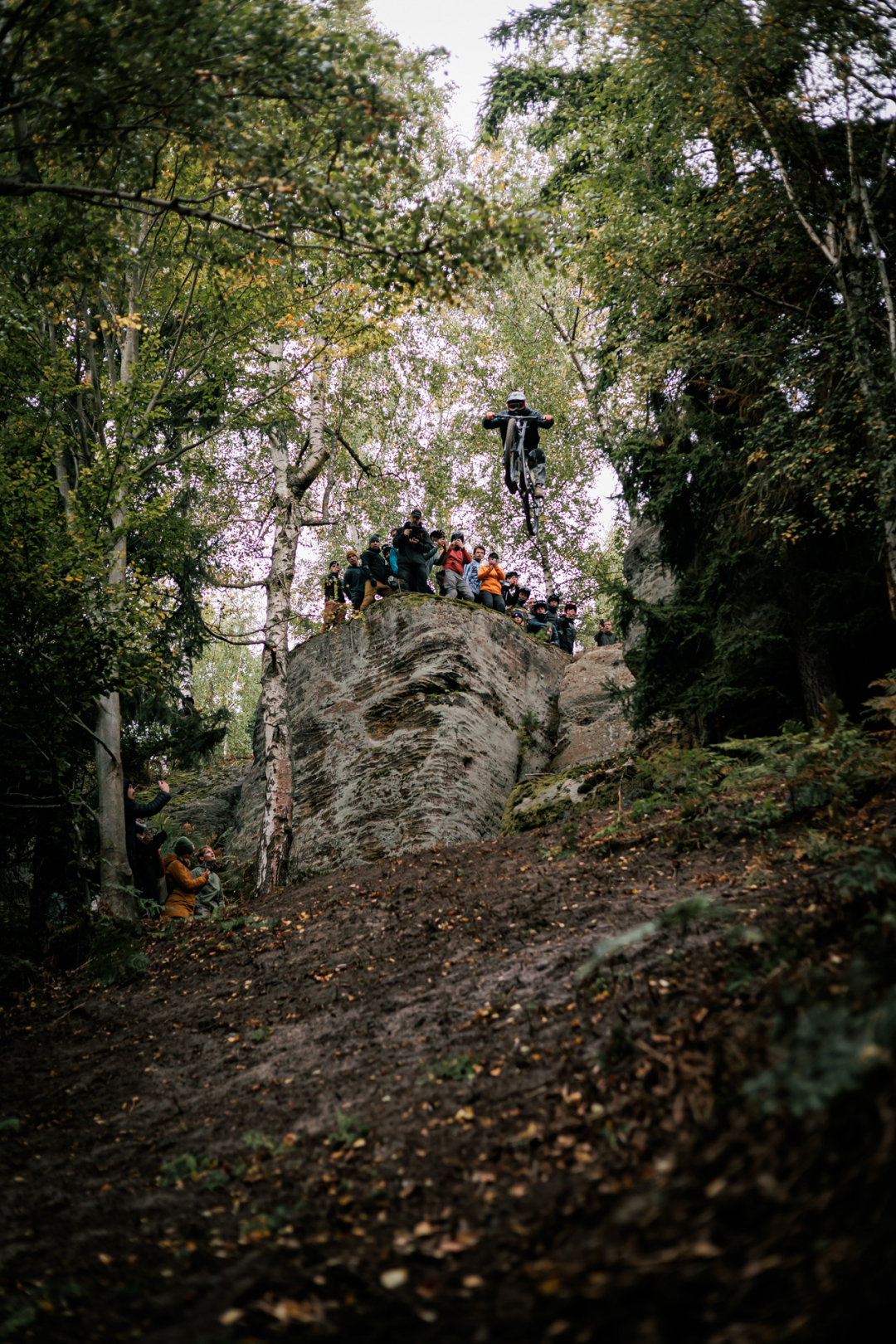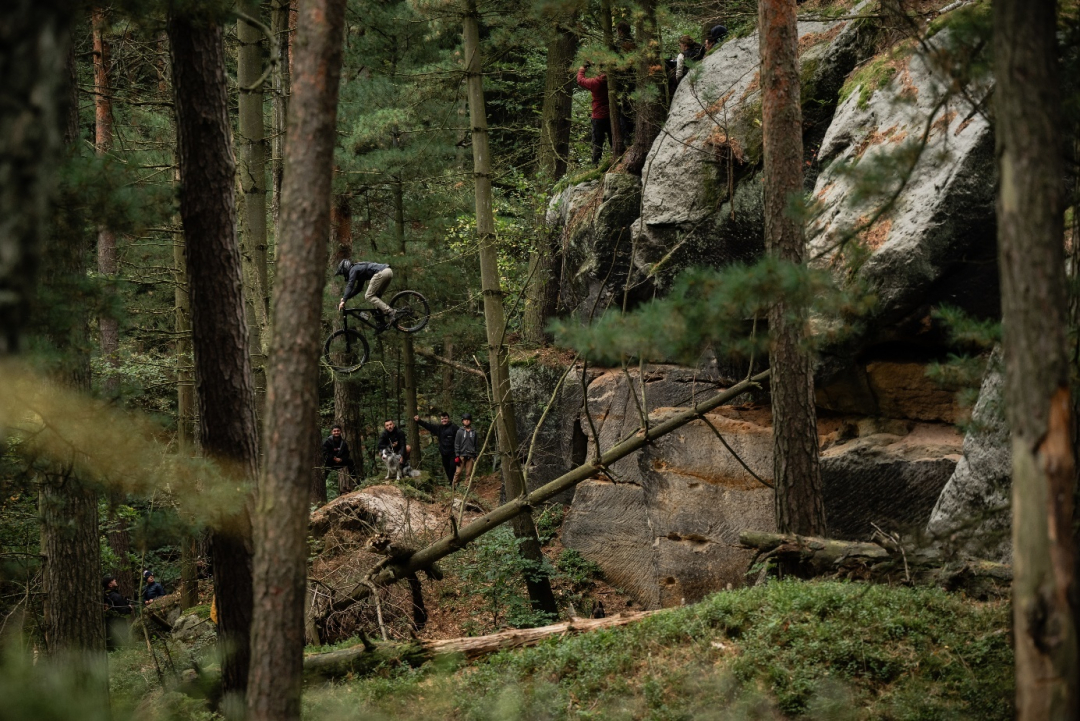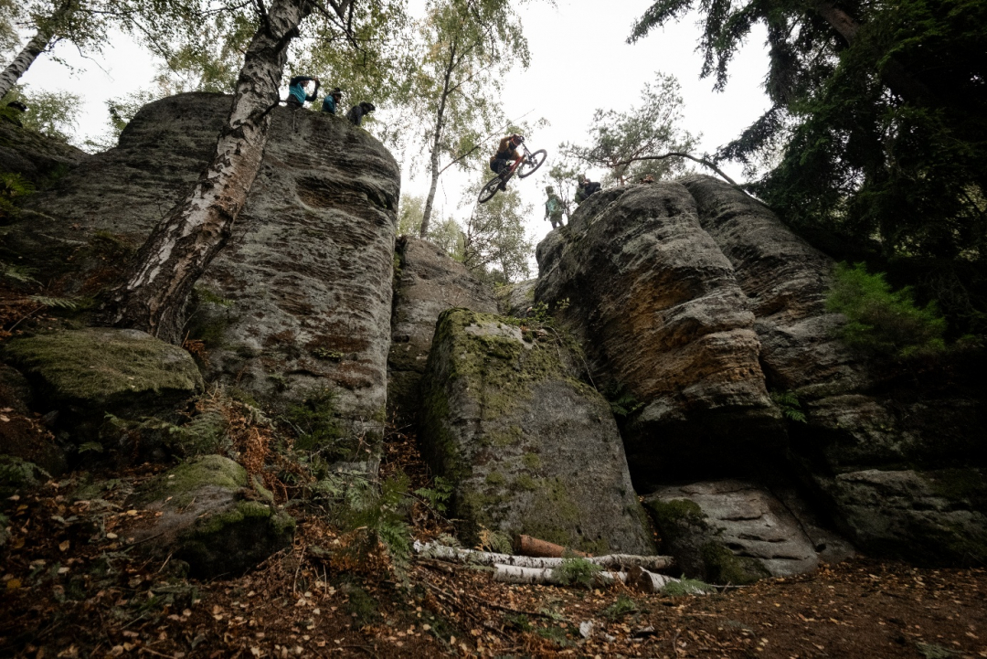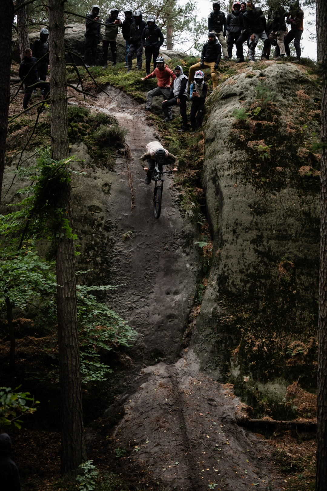 Poslední překážka tohodle dne. Řikejme tomu seskok ze skály mezi dvěma skalníma věžema. Nebojim se říct osum dolů a minimálně desítka na hranu. Rozhodně největší věc týhle akce. Stejně jako plotna, neodzkoušená. Většina krotitelů jen kroutí hlavou, že jsme se p*srali... Docela fouká, nečekaný poryvy a vypadá to na ceďák každou chvilkou. Po chvíle špekulace, přichází Marťas Krejčí, že to dá, zkouší se nájezdy. Vypadá to slibně, ale ten první vostrej pokus? Marťas jede minimálně o půlku rychlejc než při nájezdech a letí, letí a letí a my víme, že je to v... ehm daleko. Daleko, hluboko a bez šance to udržet. Dopadá lehce na zadní a jak položí předek, tak mu ten náraz vyrazí řídítka z obou rukou. Jde do šipky přes řídla a letí dalších několik metrů vzduchem, smotává se, míjí jen tak tak strom a kutálí se dál. Zastaví a nehýbe se, strašný. Všichni stichnou. Záchranář k němu přispěchá, další kluci tam běžej. Leží, ale komunikuje a jako zázrakem po 10 minutách vstává a belhá se pryč. Ruka bolí, žebra bolí, je otřesenej, ale na to že právě skočil ze střechy čtyřpodlažní bytovky je na tom dost dobře. Tyhle momenty jsou pro mě jako organizátora dost těžký, vidět kámoše jak si takhle strašně naloží nechceš.