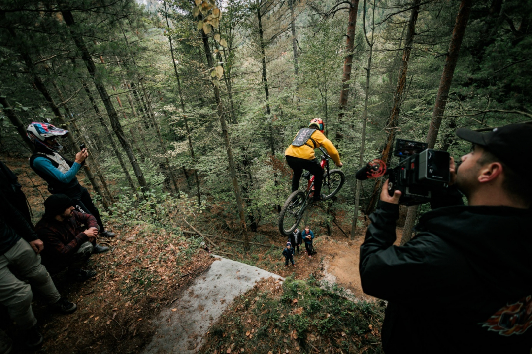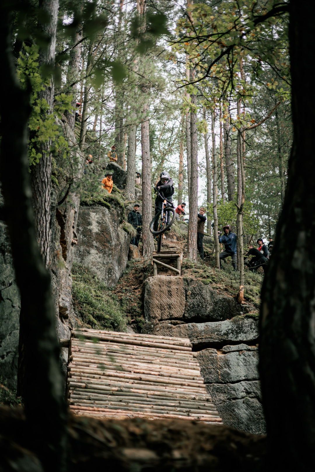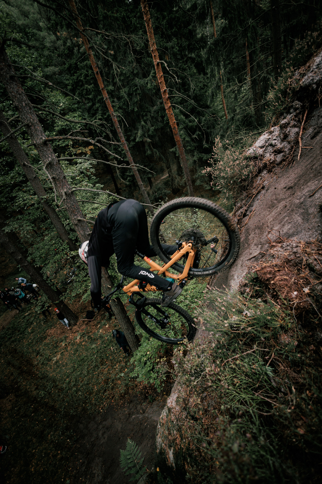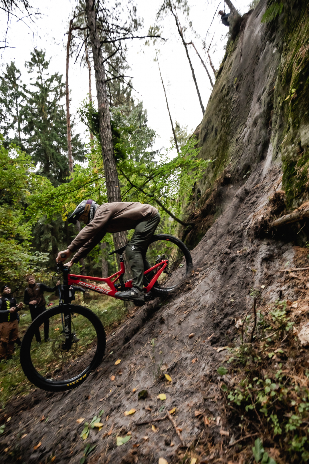 První na to jde Višeń, bez emocí, beze strachu, ve stylu uhněte já jedu a posílá to tam. Následují téměř všichni, David Číla zkouší alternativní příjezd a dává, Višeň přijíždí po předku a největší k*ndovinu předvádí Filip Dankanič, kterej to ze zlomu odpaluje a přeskakuje vertikální část sjezdu. Průhyb kotníků i těla napovídá, že to uplně není to pravý vořechový. Ale je to kluk trénovanej, takže podržel a odjel!