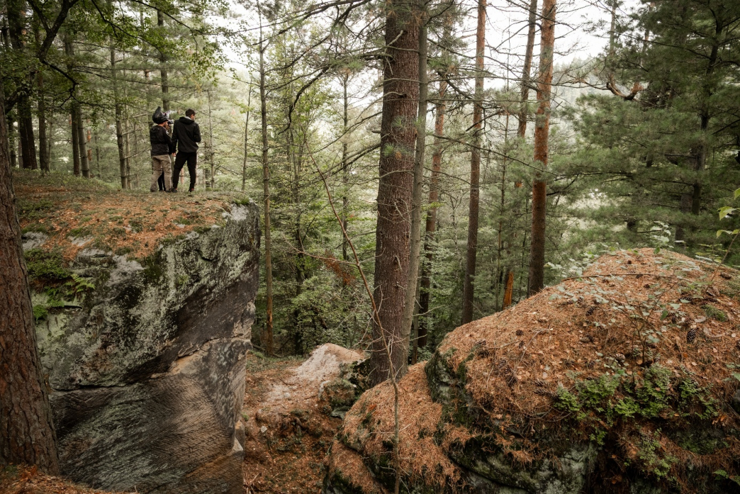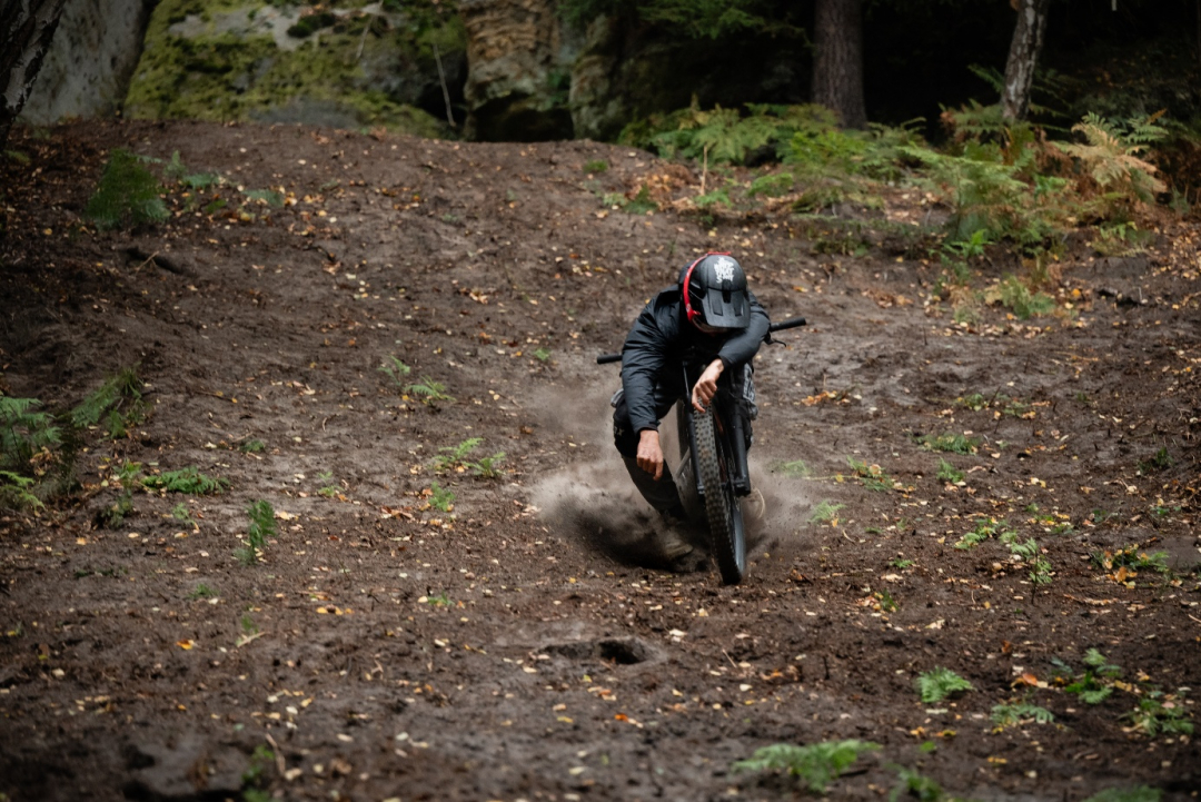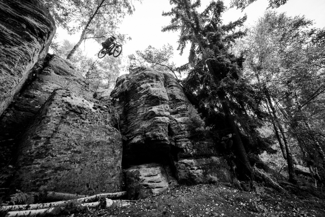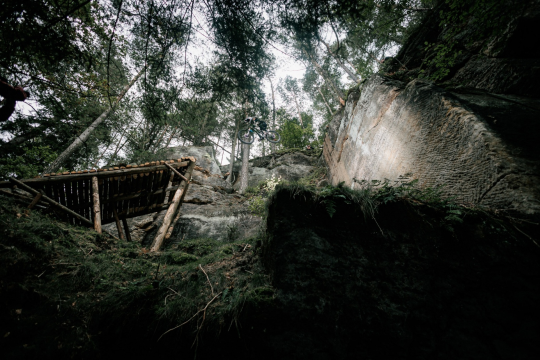 Přesun na první spot, drop ze skály. K hraně to máme pěknejch pět dolů, čtyři do dálky, totálně slepej příjezd na dvě otočení klik a po dopadu solidní ródeo dolů do rokle cca dvacet vejšek, kde se Ti to rozpiňdouří ani nemrkneš.
