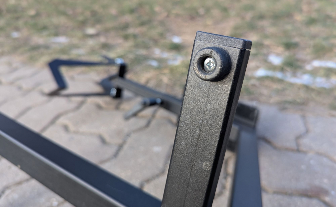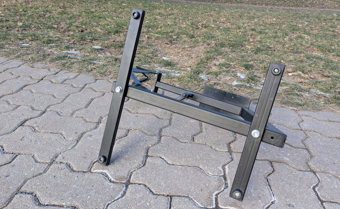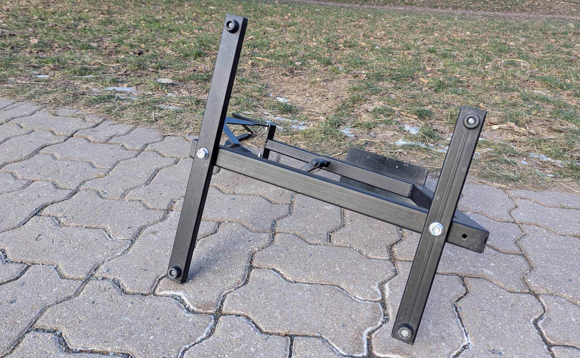 K mému překvapení od kurýra tedy přebírám celkem velkou krabici, ale jak rychle zjišťuji, je jen díky tomu, že stojan je rozdělen na čtyři díly. Na jejich smontování mi stačí jedním imbusem dotáhnout čtyři šrouby a ručně jednu ráčnu. Za pár minut hotovo. Stojan je vyroben z ocelových profilů o celkové váze do dvou kilo. Je stabilní, zpracování na mne působí velmi dobře, lakování taky vypadá kvalitně, gumové nožičky chrání podlahu.