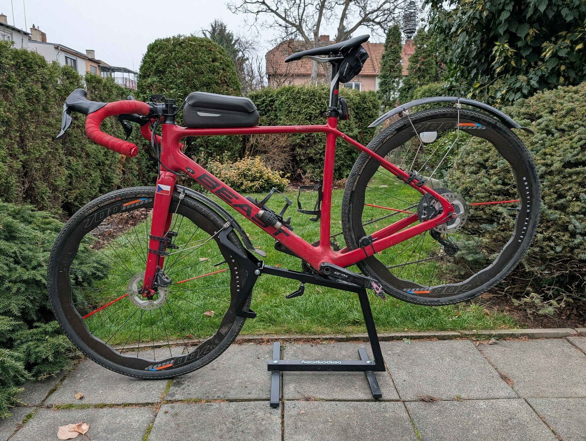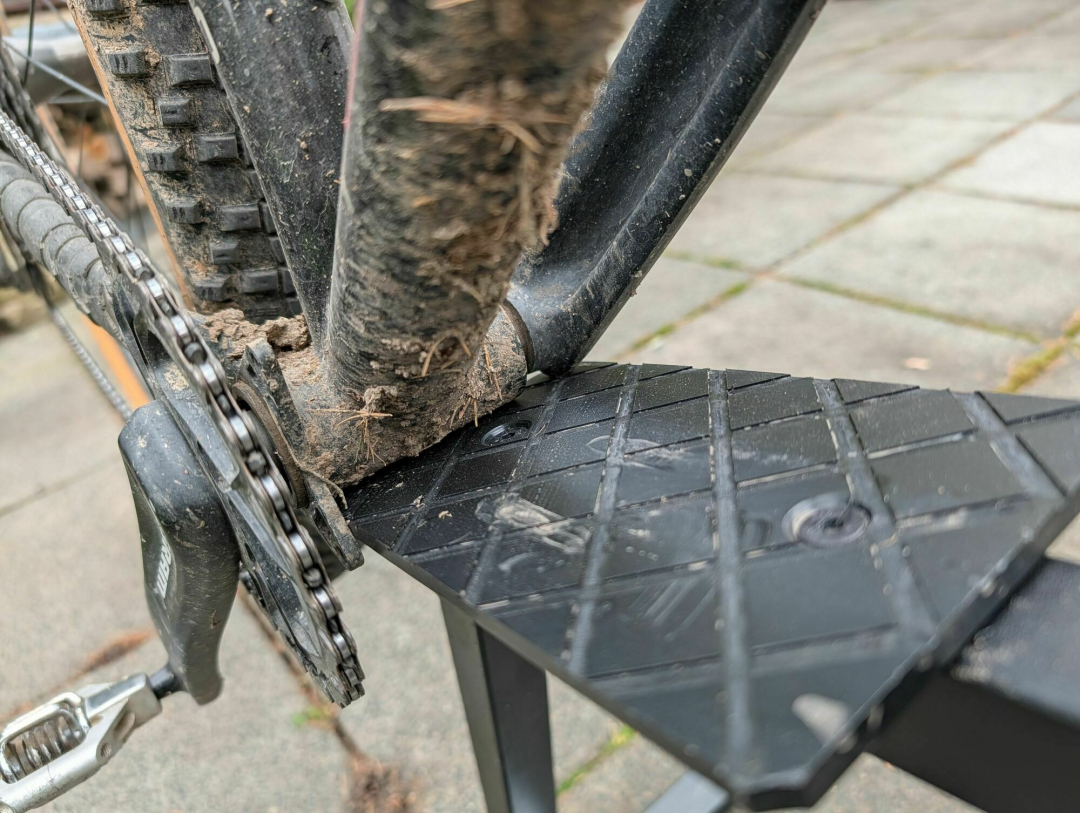 Zkusil jsem do MX style stojanu umístit i užší XC kolo nebo gravel a v pohodě. Na mytí ok, bohužel na celkový servis použít nejde, protože plastová destička je širší (rozměry 18x10 cm), aby na ni motor měl dostatečnou oporu. Tudíž u kol bez motoru, které mají užší střed, neotočíte klikami. Škoda. Doufal jsem, že použiji stojan pro celý svůj vozový park. Možná by řešením bylo opěrnou desku zúžit o 2-3 cm.