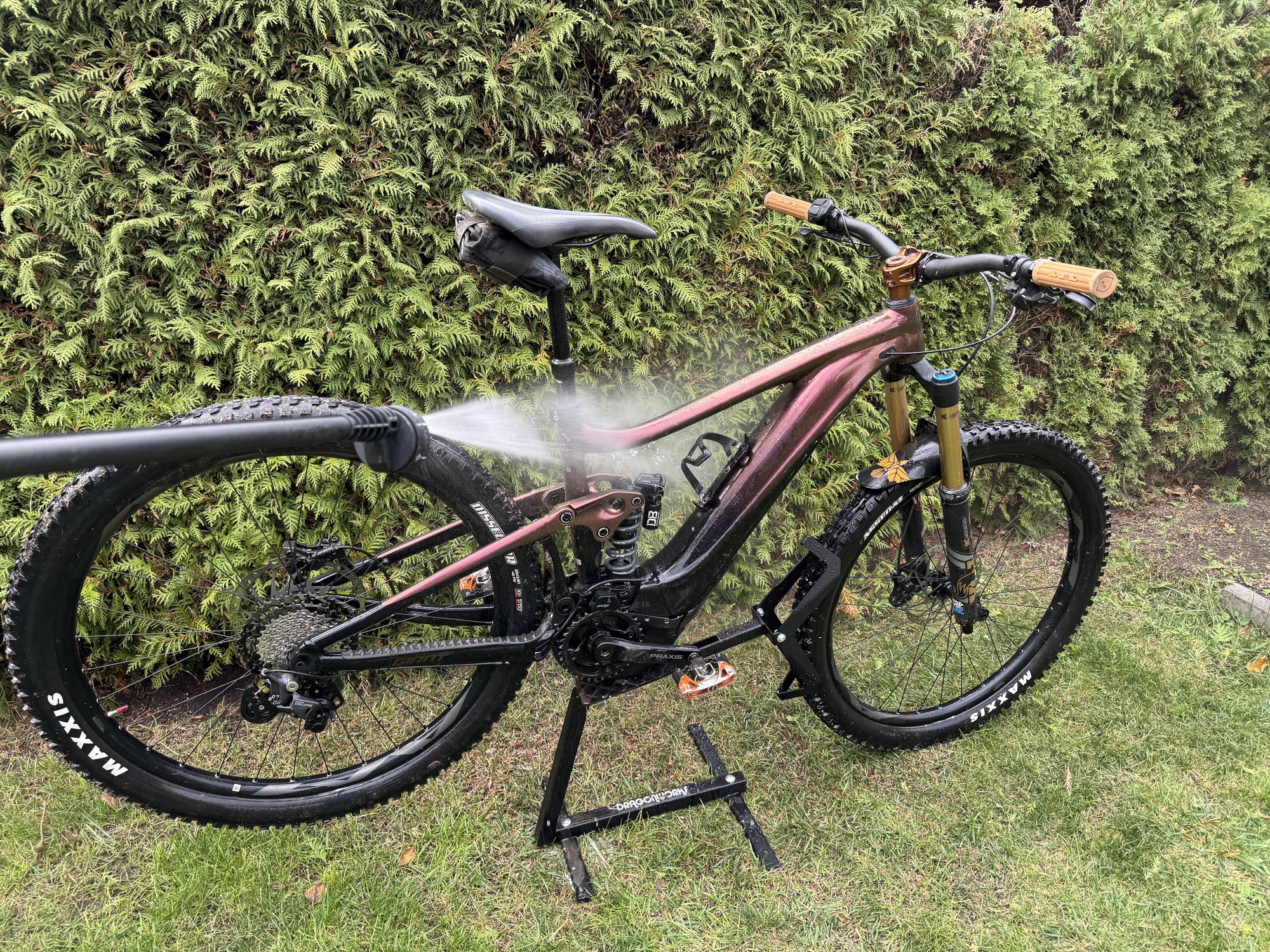 Kolo zaparkované, tak můžu provést potřebnou údržbu. Nejdřív je potřeba kolo umýt a až následně udělat servis. K obojímu je stojan vhodný. S klikami lze pohodlně a bezpečně točit, aniž by někde něco dřelo nebo zavazelo.