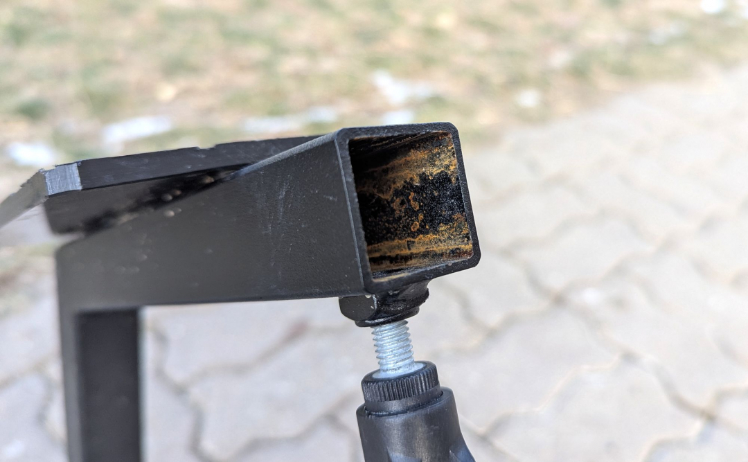 Když už jsem zmínil mytí kola, tak musím i zmínit, že jsem po nějaké době stojan kvůli transportu v batohu rozdělal a překvapila mne mírná koroze na nastavitelném rameni. Teda ona spíš byla uvnitř té trubky, ve které je rameno zastrčené. Ale nebylo to nic strašného, co by se hadrem nedalo otřít. Ale jen upozornění, pro pořádkumilovné bikery, že po kontaktu stojanu s vodou, je dobré rameno vytáhnout a nechat stojan vyschnout.