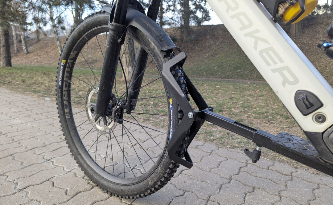 Před prvním použitím je třeba nastavit délku ramene, na kterém je kolébka pro uchycení předního kola. Tak, aby toto kolo bylo ve styku se zemí a motor seděl na plastové plošce. Plastová destička je dostatečně veliká, takže na centimetru nesejde. Bike tedy stačí mírně vzadu nadzdvihnout, předním kolem zacouvat do kolébky a motor usadit. Hotovo. Žádná věda. Kolo díky své váze sedí opravdu bezpečně. Sice je destička z tvrdého plastu, ale nemám pocit, že by kolo mělo po ní tendenci klouzat. A i kdyby náhodou tak na jedné straně sklouznutí zabrání převodník a na druhé snad klika. Ale jsem přesvědčený, že je to velmi málo pravděpodobné.