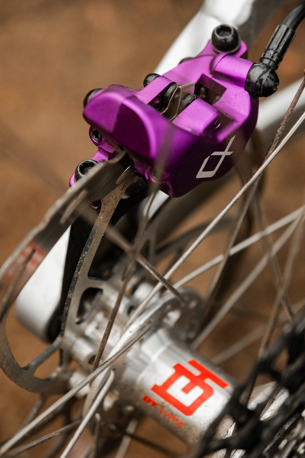 Poměrně masivní brzdový třmen v sobě ukrývá čtyři písty s průměrem 17 mm. Nic neobvyklého, řeknete si, ale to zajímavé najdeme zezadu a z boku třmenu. Dvojdílné tělo třmenu disponuje dvojicí odvzdušňovacích portů, pro dokonalé odvzdušnění pravé i levé poloviny třmenu a nikde se nemohla schovat ani mikrobublinka vzduchu.