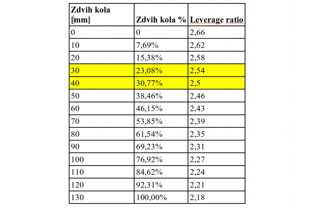 - Přirozená mírná progresivita (klesající leverage ratio) s oporou v oblasti sagu 20 - 30%. Cíl: Stabilita při šlapání a ochrana proti tvrdým dorazům.
