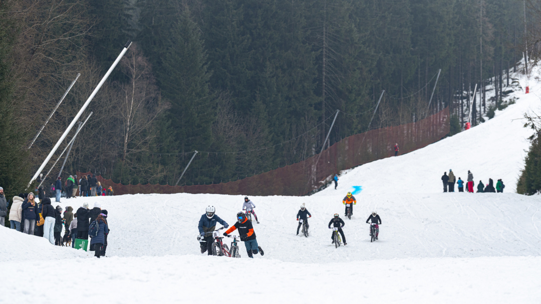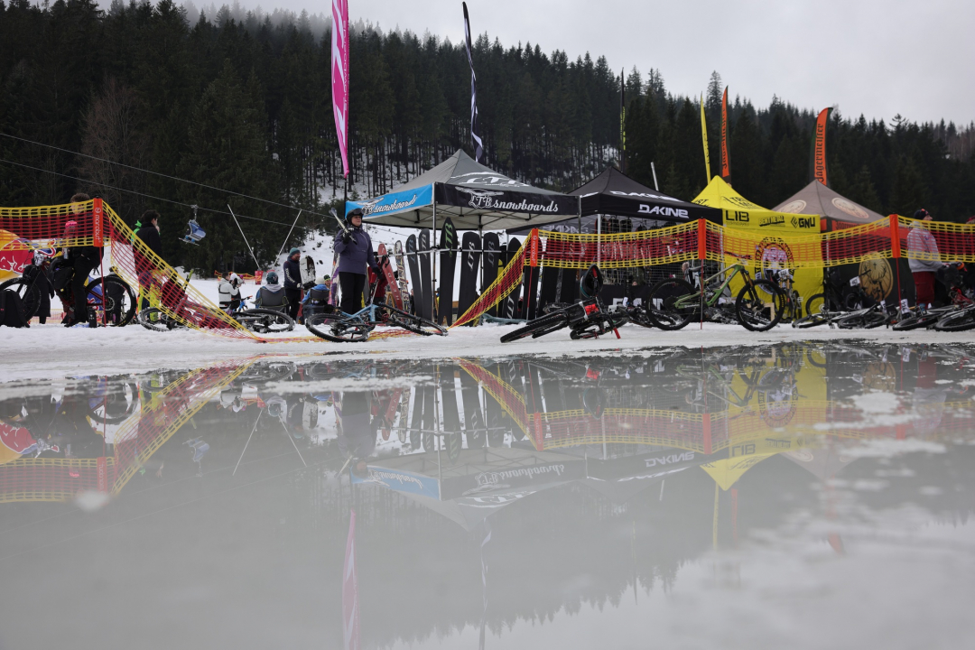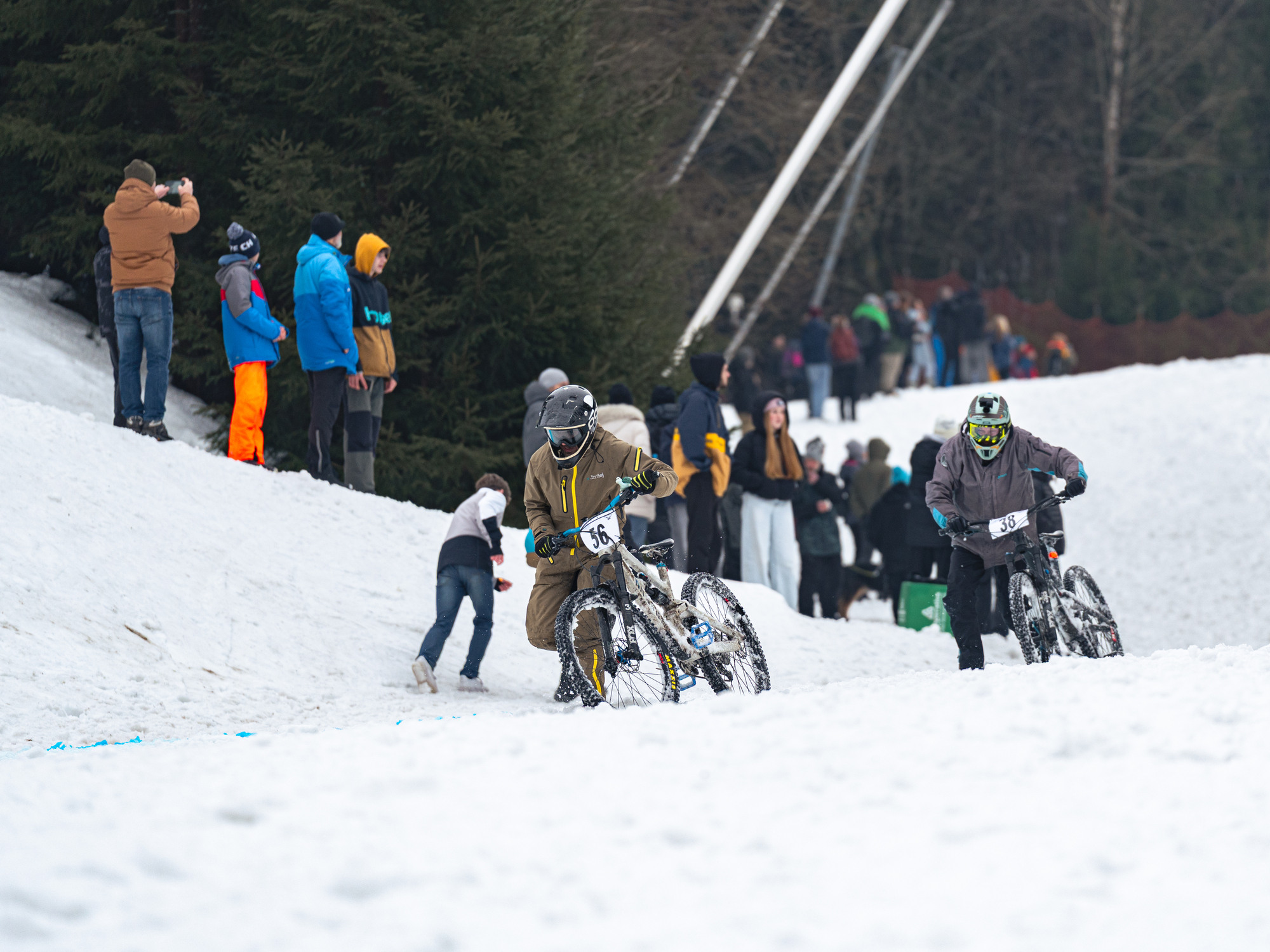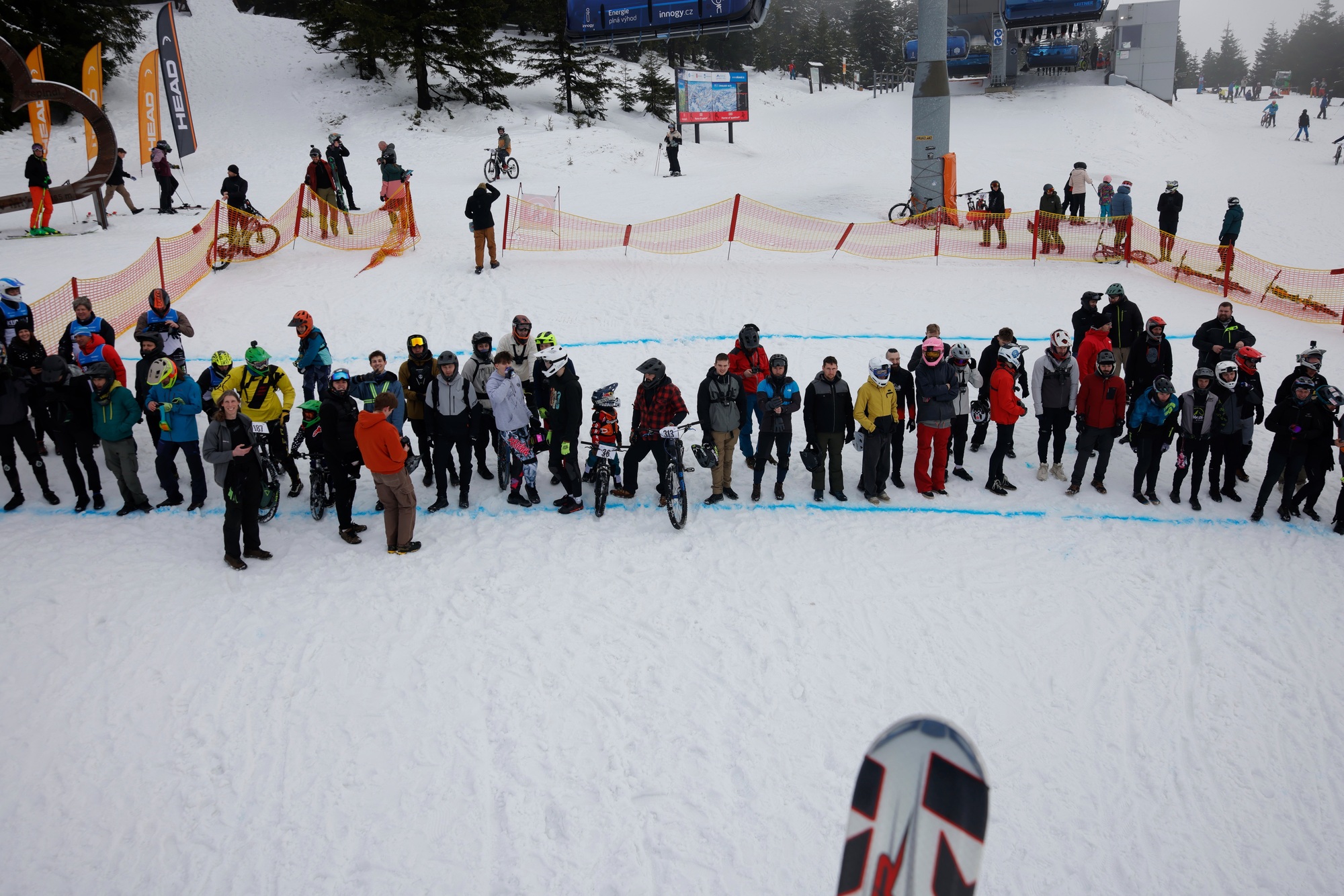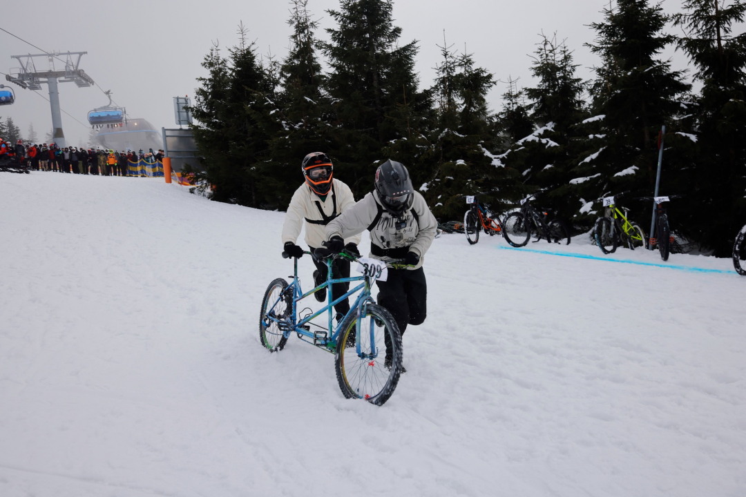Od startu bylo jasné, že nás čeká nelítostný boj! Hromadný běh v rozbředlém sněhu byl delší než obvykle. Nasednout na kolo a udržet stopu byl nadlidský výkon. S přívalem jízd se ze sjezdovky stalo oraniště bez příkras. Hromadné pády se kumulovaly v srdci Krkonoš jako hrušky na kompostu. Občas tento cirkus připomínal cyklokrosové klání v těch nejhorších možných podmínkách. Na dvoukilometrové trati nebyl výjimkou čas okolo 10 minut (loňský průměrný čas byl 4 min.), do cílového prostoru se muselo dobíhat. Za cílovou páskou to mnohdy vypadalo jako po dokončení závodu Ironmana. Závodníci popadali dech vleže, kolikrát i s hlavou zabořenou do roztátého sněhu.
