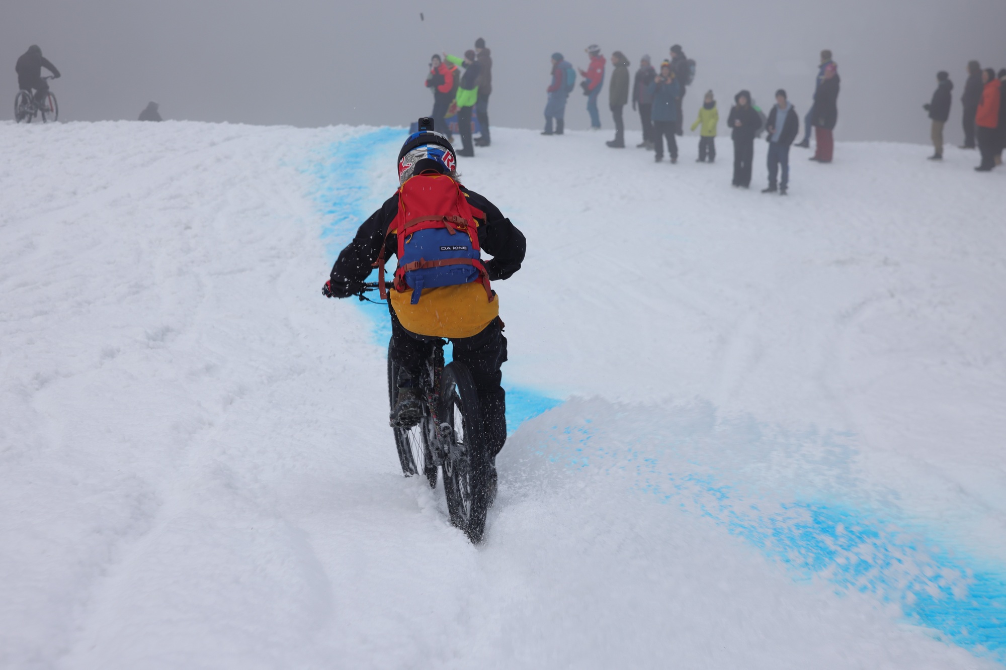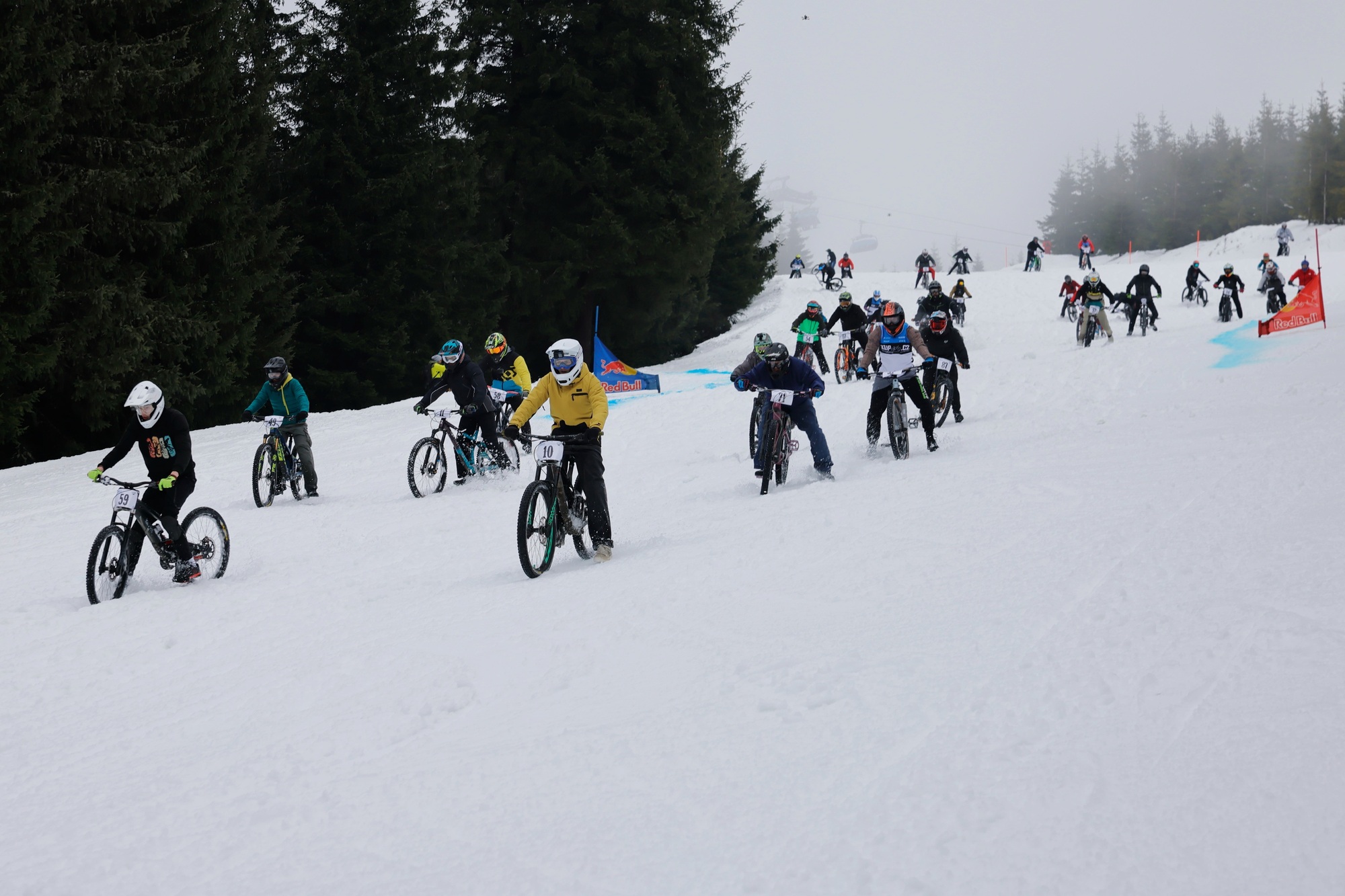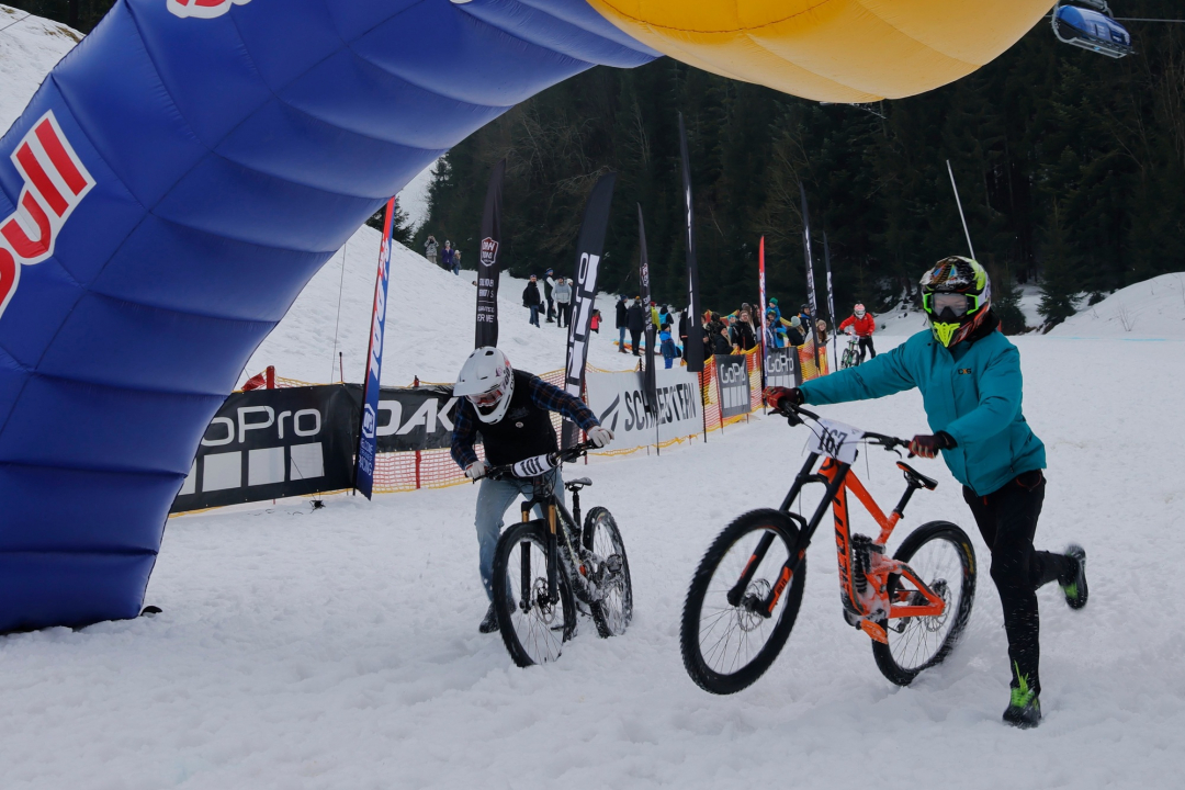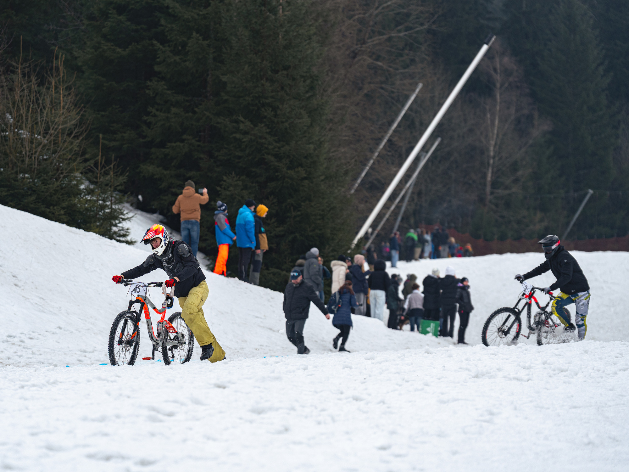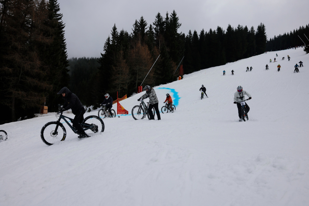 Od startu bylo jasné, že nás čeká nelítostný boj! Hromadný běh v rozbředlém sněhu byl delší než obvykle. Nasednout na kolo a udržet stopu byl nadlidský výkon. S přívalem jízd se ze sjezdovky stalo oraniště bez příkras. Hromadné pády se kumulovaly v srdci Krkonoš jako hrušky na kompostu. Občas tento cirkus připomínal cyklokrosové klání v těch nejhorších možných podmínkách. Na dvoukilometrové trati nebyl výjimkou čas okolo 10 minut (loňský průměrný čas byl 4 min.), do cílového prostoru se muselo dobíhat. Za cílovou páskou to mnohdy vypadalo jako po dokončení závodu Ironmana. Závodníci popadali dech vleže, kolikrát i s hlavou zabořenou do roztátého sněhu.