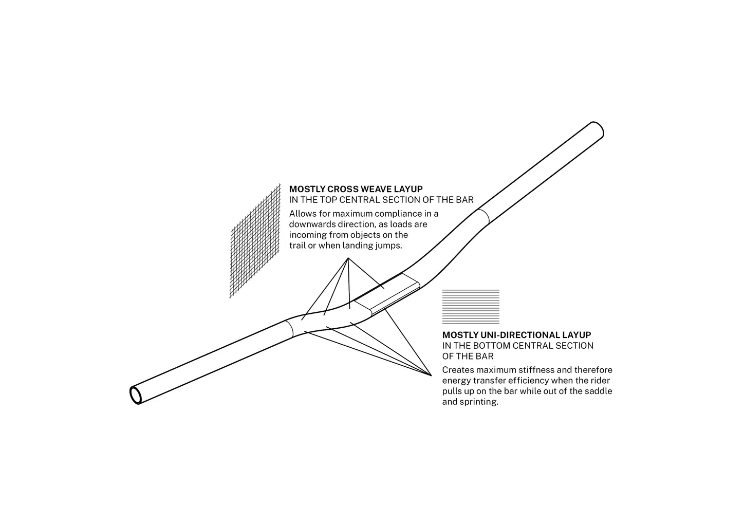Klíčem k "ideální poddajnosti" řídítek 6-7 je promyšlené vrstvení karbonu. V horní středové části dominuje křížové pletení, které maximalizuje vertikální průhyb směrem dolů - tedy přesně tam, kde potřebujete pohlcovat nárazy z trailu nebo dopady skoků. Naopak spodní část využívá primárně jednosměrné vrstvení. To zajišťuje maximální tuhost a efektivní přenos energie v momentě, kdy za řídítka taháte nahoru, například při sprintu ze sedla.