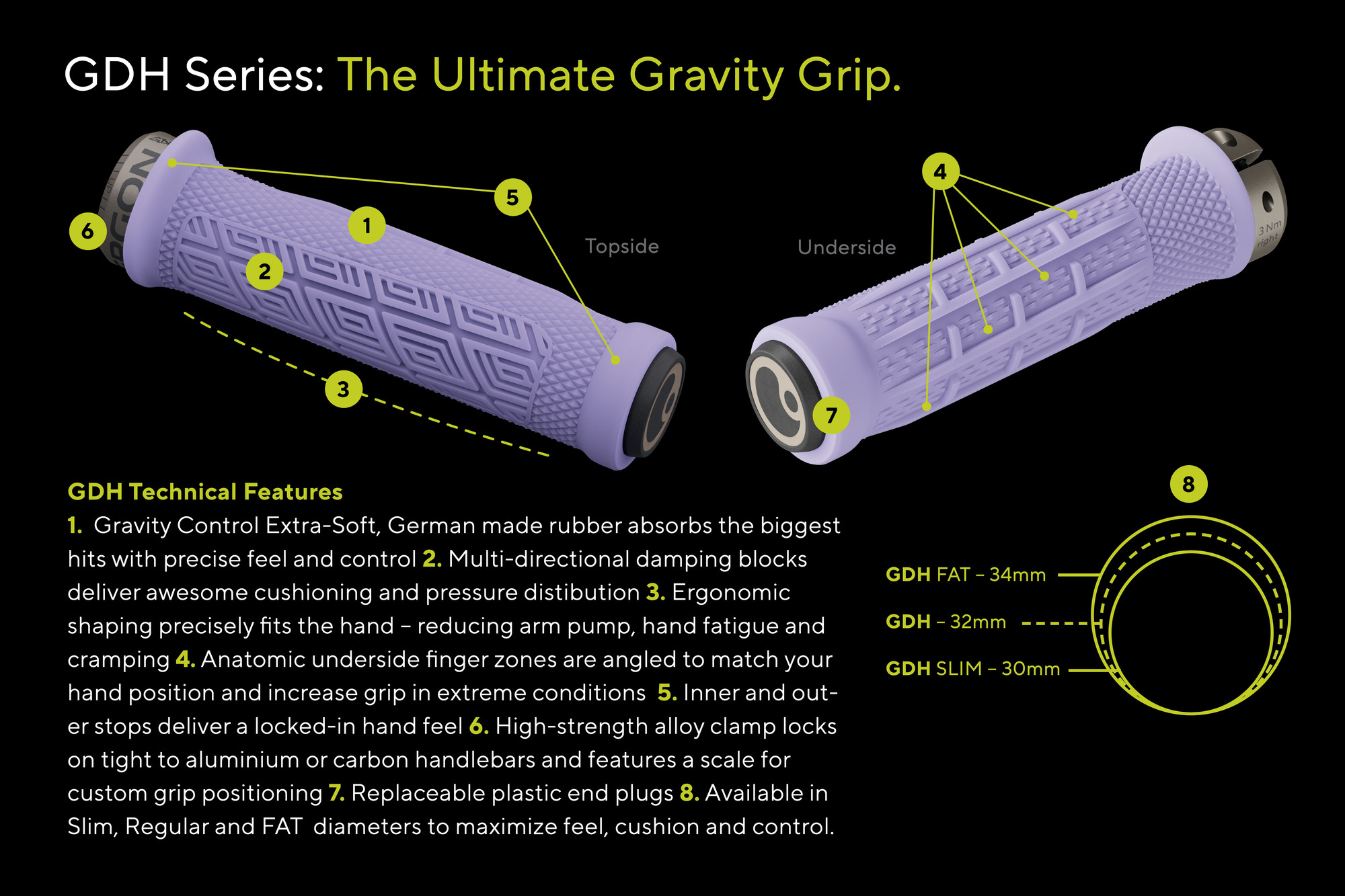 Osvědčený design GDH s vícesměrným tlumením, anatomickými zónami pro prsty a unikátní směsí GravityControl Rubber je nyní dostupný ve dvou dalších velikostech. To umožňuje jezdcům vybrat si grip přesně podle velikosti ruky a stylu jízdy.