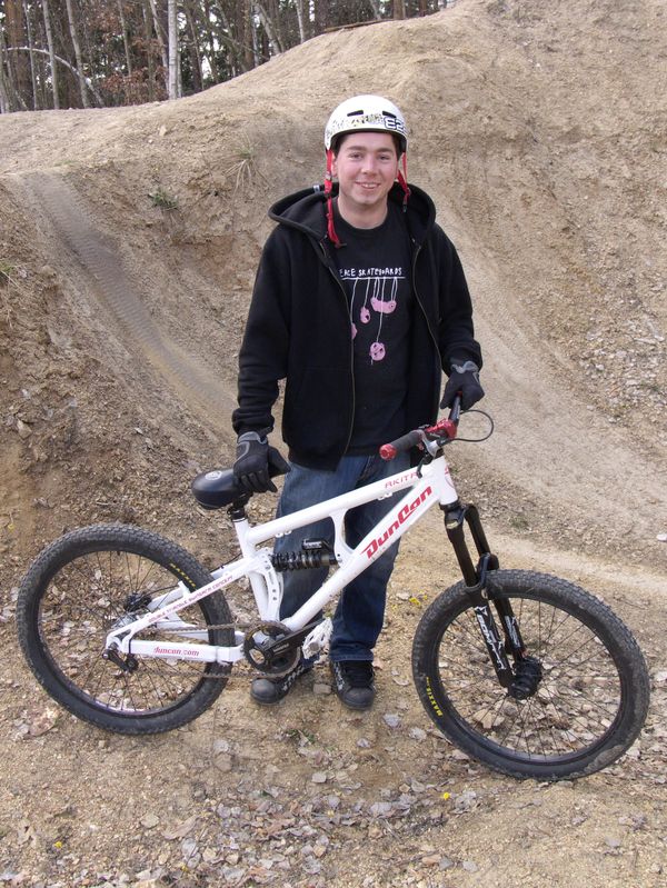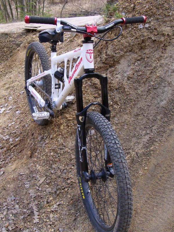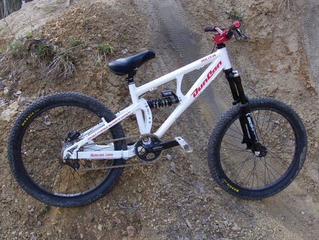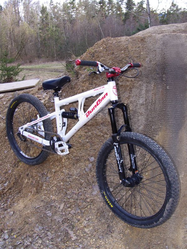 Číča je známý obdivovatel malých dívek a malých kol. Není tedy divu, že si vybral maličký rám Duncon Akita ve velikosti 14,5", osadil ho koly 24" který se mu osvědčily už na pevňáku a činí z tohohle kompletu opravdu hravý stroj. Vidle na 130 mm dobře sedí ke geometrii rámu i zadním zdvihům, který se daj nastavit ve třech polohách na 110, 130 a 150mm. Na tlumič byla namontována o něco měkčí pružina než sériová, která zajišťuje potřebnou citlivost, která uleví jeho zhuntovanejm kolenům.