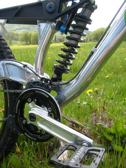 Kolo už mám nějakou tu chvíli doma, za barákem hned pořádný kopce, tak jsem ho pořádně prověřil. Je dobře ovladatelné a hlavně čitelné, celkově mi sedí i geometrií. Rám má také dvě polohy uchycení tlumiče. Jedna ryze sjezdová, kterou mám nastavenou a druhá spíše FR, kdy má kolo strmější úhel vidlice, výš střed a je celkově točivější.