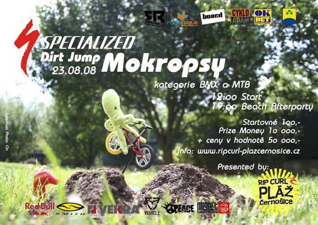 Dovolujeme si vás dne 23. srpna pozvat na dirt jumpové závody, které se uskuteční v areálu Rip Curl Pláže Mokropsy, který kromě dirtoviště obsahuje menší skatepark a pláž s beach volleybalovým kurtem, petanque hřištěm a plážovým barem s výběrem alko a nealko nápojů, zmrzlin atd. Vše samozřejmě bude během závodů v provozu a navíc další stánek od firmy Specialized který bude sloužit jako servisní bod pro smolaře kterým se během závodů něco na kole pokazí. Chybět nebude ani gril s klobáskami steaky apod.