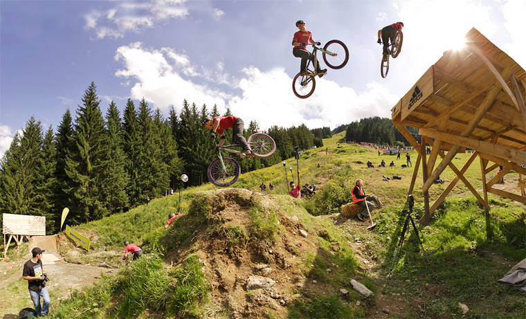 Další hodně trikově zajímavou překážkou byl step-up/step-down, ze kterého se 360, tailwhipy a cancany posílali jako o život. Po wallridech následovali ještě dva obří dirty, na kterých se motalo samozřejmě všechno.
