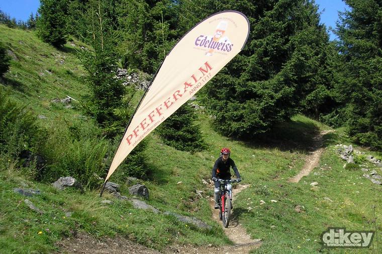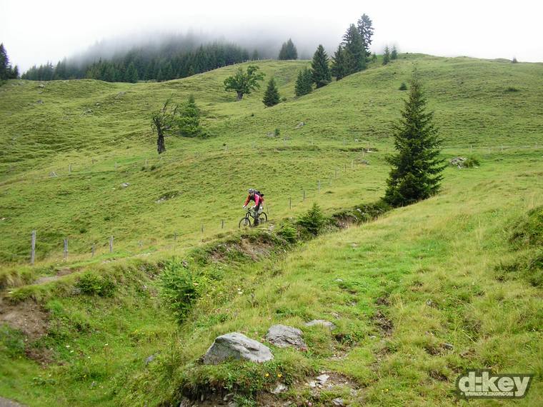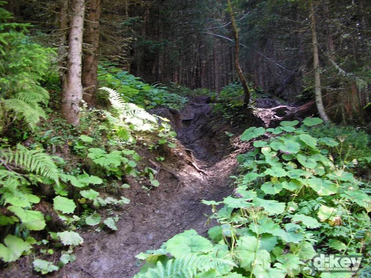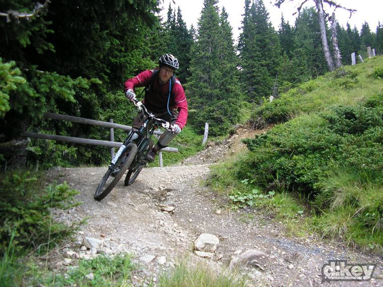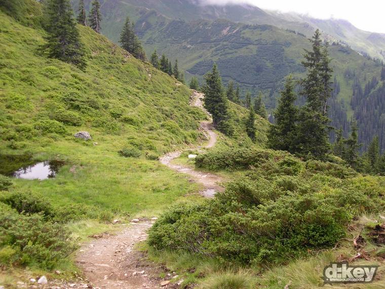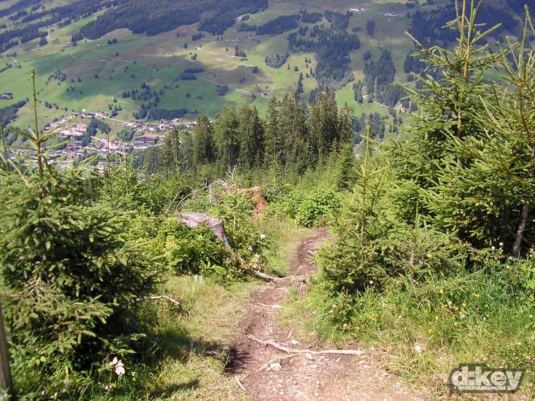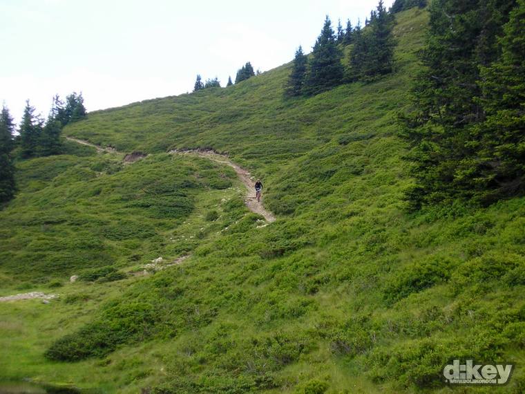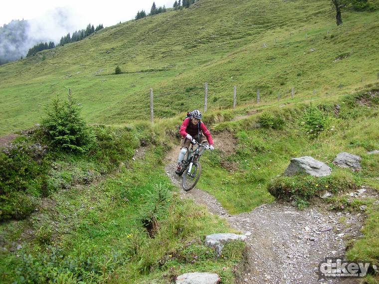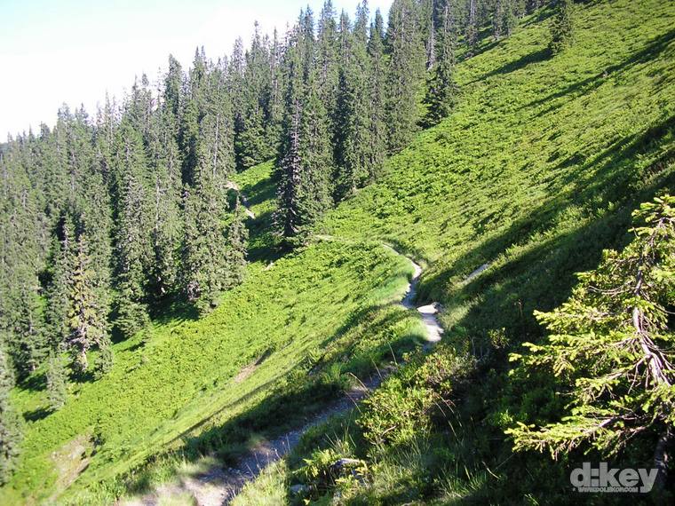 Po výjezdu na Schattberg nastává to nejhezčí, teda, pokud z paměti vymažu to strašlivý stoupání na Schattberg West Gipfel (2096 m). Je to po šotolině a stojí to za to, zvláště pokud jako já máte na kole 30tku představec. Odměna je ale tady. Nádhera v podobě skoro 10 km klesání. Celou dobu překrásný single. Tady taky pravděpodobně potkáte nějaké lidi, minimálně na zahrádce u chaty Hackelbergalm. Za další chatou, Bergstadl se trail mění v regulerní déháčko, znovu bych řekl, že hlavně kvůli absenci jakékoli údržby. Vystajlovaní lokálové v bílých oblečkách mě přesvědčují, že jsem to se 6inch kolem neseběhl zas tak nejhůř…