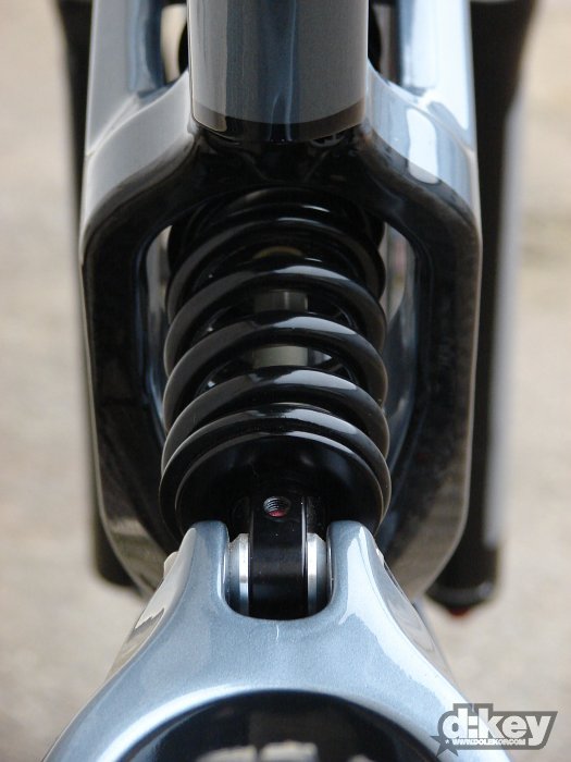 Rám je celokarbonový monokok, to znamená, že jak přední, tak i zadní trojúhelník jsou monokokové, úhel hlavové trubky je 65 stupňů, zdvih zadní stavby dosahuje 8,65" (22cm), rám se na první pohled jeví jako jednočep, při detailnějším pohledu objevíme rafinované přepákování šlapacího středu.