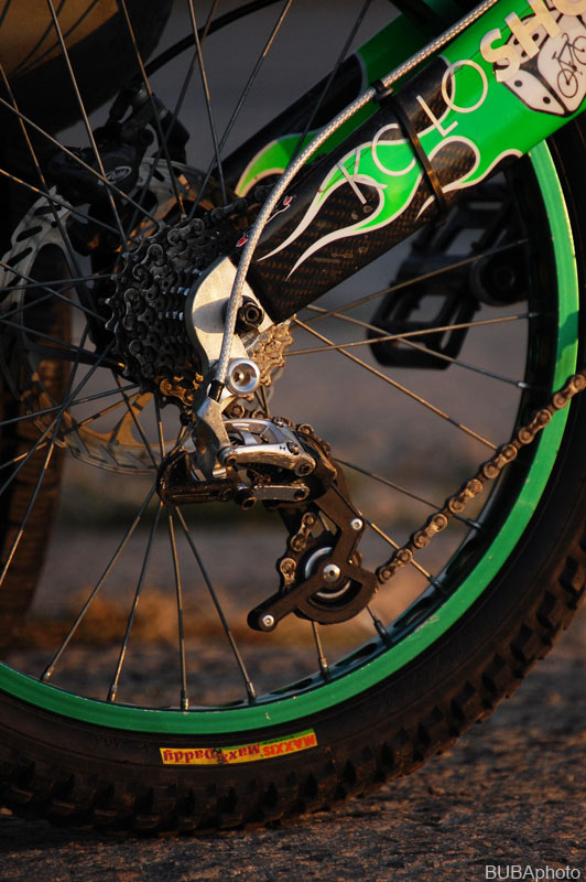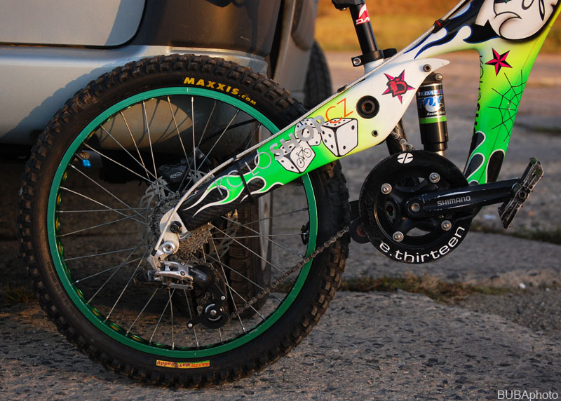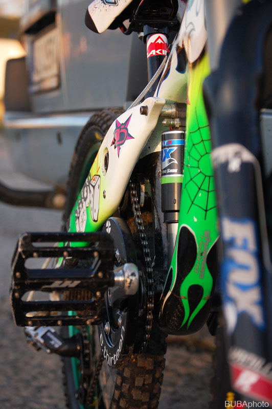Určitě vás zajímají nějaký specialitky a vychytávky. Takže asi největší individualita je samotný rám od Krutor extreme bikes. Zatím jediný takovýto karbonový speciálek na dvaceti palcová kola se 150mm zdvihu na světě. V zimě dostal, vlivem vnějších okolností, nový kabátek od Slimgrafix, což jen podtrhlo jeho jedinečnost. Rám je mega předimenzovanej… Tudíž tuhej. Zajímavostí na tomhle přepákovaném jednočepu je vedení řetězu, které je řešené přes integrovanou kladku, podobně jako to má Balfa. Tím se dosáhlo menšího pnutí řetězu, při plném chodu zdvihu. Ve spod vede řetěz upravený jednoramenný napínák od Bikehazard, samozřejmě v zeleném eloxu.