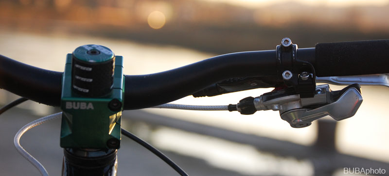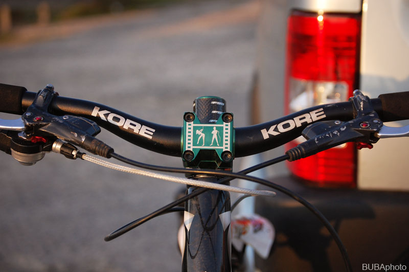 Co k osazení. Tak většinou nekoukám na váhu a co si budem nalhávat, čumím hodně na estetiku, takže i přesto jak je kolo malé, není úplně nejlehčí. Na FR ne tolik vídanou věcí jsou trialové odvrtávané ráfky, což váhově jistí jejich šířku a také to poskytuje duši prostor k úniku při silné kompresy, tudíž se snižuje riziko proražení. Ródla od značky KORE, o jejíž comeback se snaží koloshop.cz, drží pimp představec BeachBitch, na přání opět v zeleném eloxu s vygravírovaným nápisem „BUBA“. Držení řídítek zpříjemňují gripy Try-all, pěnové, velmi pohodlné a umožňují větší a pevnější úchop řídítek. Abych nemusel zápasit s přepěchovanými řídítky, nasadil jsem vychytávku od Avid, tj. Avid Matchmaker, malá věcička, která Vám pomůže více separovat řazení od řídítek a propojí ho s uchopením brzdové páky. Můžete si tedy posunovat objímku brzdy s řazením, jak je libo. Dopustit určitě nedám na rock ring od kultovní značky e.thirteen, který vozím od doby co mám Krutora a díky nízkému podvozku mi nejednou zachránil pilu.