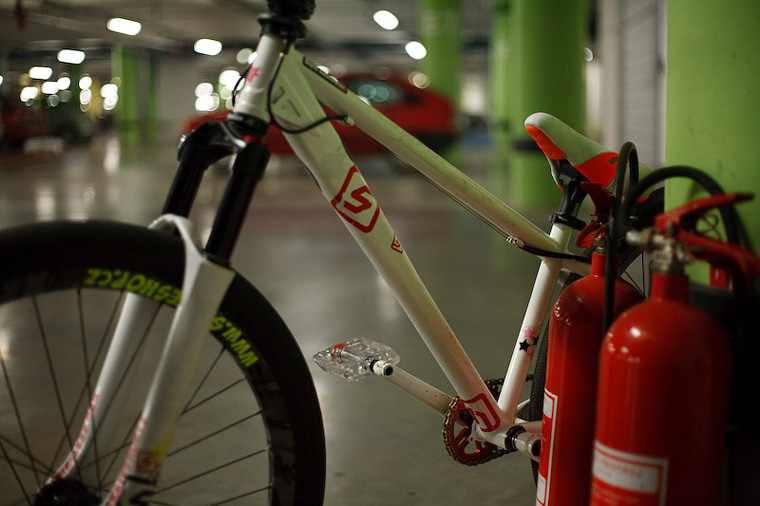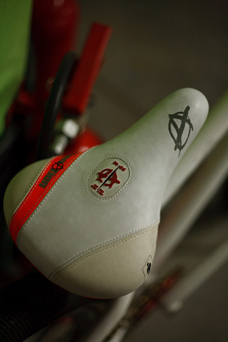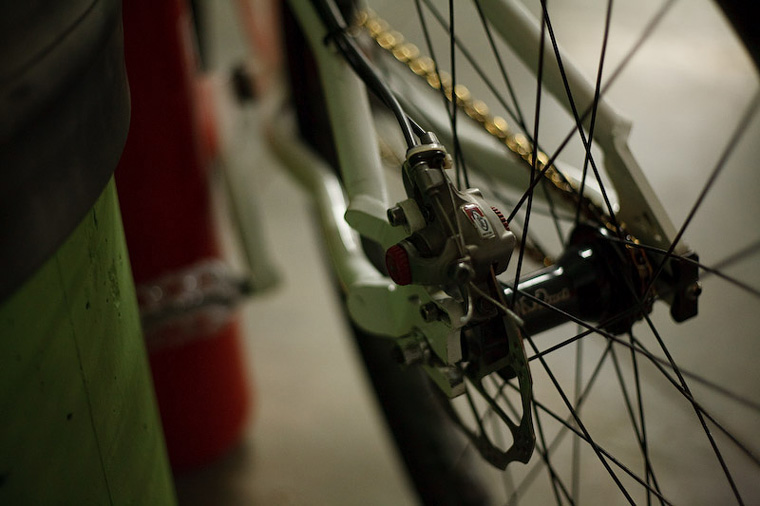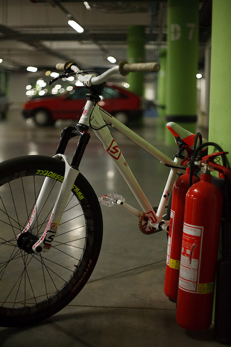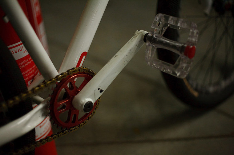 Jezdím na rámu Azonic Steelhead s vidlicí Marzocchi 4× sníženou na 90mm. Používám klasický single speed natahovaný napínákem z bmx. Super věc na barspiny a biče je mechanický twister od Odysey, jednoduše proto, že nemusím řešit jestli mám zamotaný lanko. Z páky do twistru používám super lanko Author za pár kaček. Od twistru do brzdy vedou 2 lanka, které končí v mém vlastnoručně vyrobeném adaptéru a dál už vede jen lanko jedno. Vozím teď plastové pedály, které nejen vypadají dobře, ale i jejich funkčnost je výborná. Klasické sedlo a sedlovku jsem vyměnil za komplet s pivotal systémem, který mi přijde daleko pevnější a hlavně skoro o polovinu lehčí.