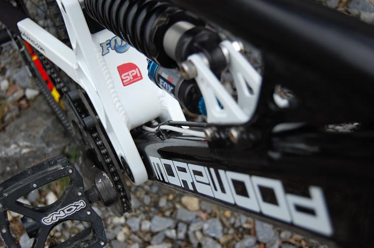 Chod zadní stavby ovlivňuje tlumič Fox DHX 5, který mi zajišťuje maximální pohodlí v terénu. Co se týče propedálu, tak ho mám vyplej a moc ho nepoužívám. Navíc velkej zdvih toho požere taky celkem dost. Do budoucna uvažuji o titanové pružině.